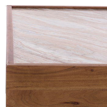 Elevate your living space with the Jaslina marble top square coffee table. This captivating piece seamlessly blends elegance and functionality with its dark walnut and brown hues. The table features a striking marble top that rests upon a sturdy wooden base, creating a harmonious balance between natural beauty and contemporary design. The combination of marble and wood adds a touch of sophistication to any room, making it a versatile centerpiece for both casual and formal settings.