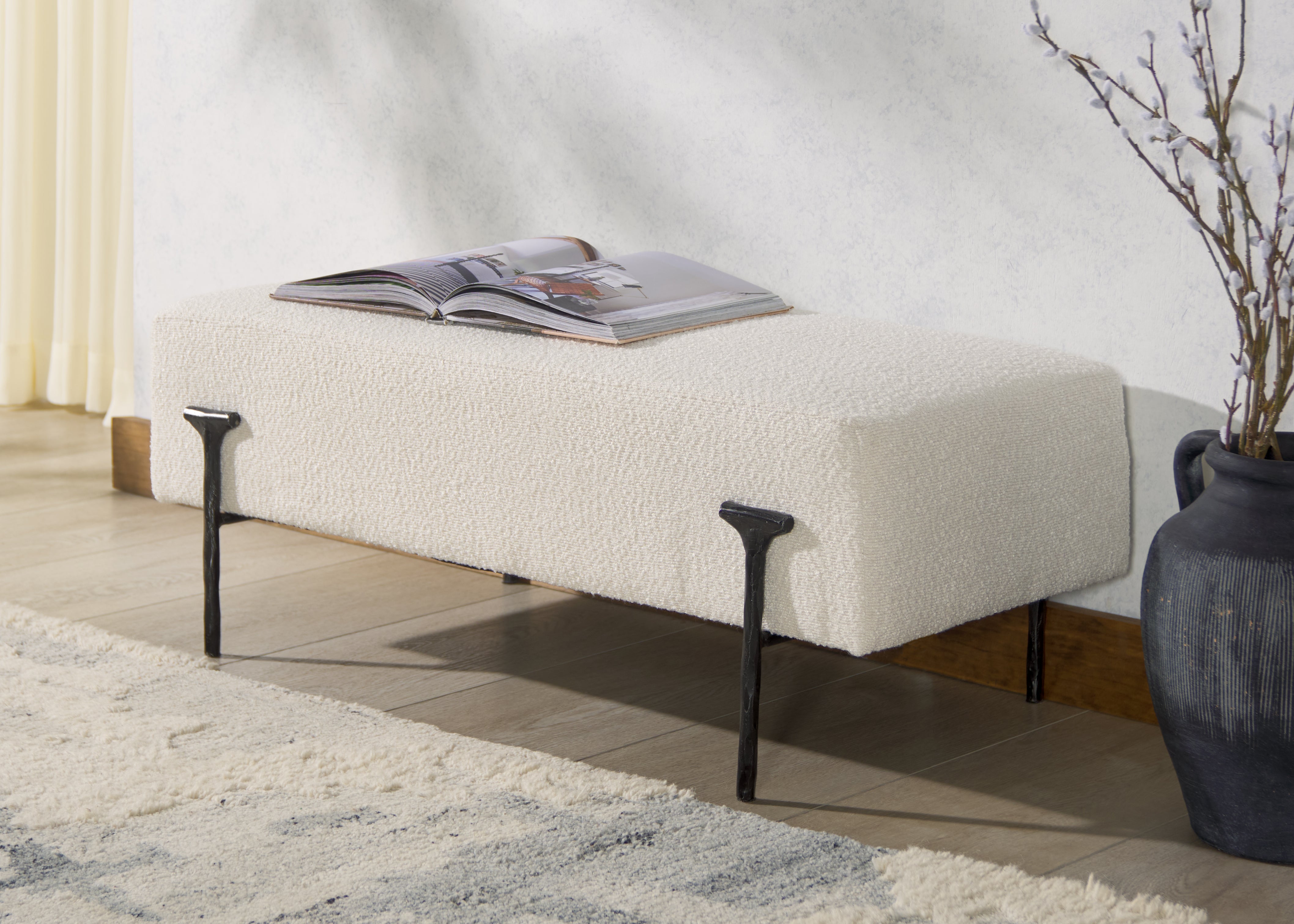 Infuse your space with a touch of elegance and sophistication with the Jessa Boucle Bench. Constructed from robust pinewood and sturdy iron, this piece is both durable and visually stunning. Its Boucle fabric is more than just a design element, it's a statement that adds a dimensional, tactile, and luxurious touch to the bench. The metal details bring a modern, warm glow that beautifully contrasts with the light Boucle fabric. The beautiful fabric, coupled with the high-quality materials used, make this bench not just a comfortable seating option but a magnificent accent piece in any home. You're not just buying a bench; you're elevating your living space to a new level of style and comfort with the unique texture and contemporary design of our Jessa Boucle Bench.