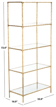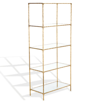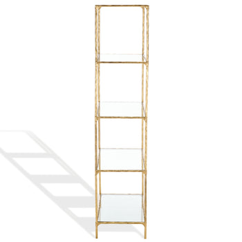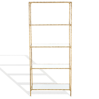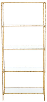 Introducing the elegant and stylish Jessa Forged Metal Bookshelf Bookcase. Crafted with precise detailing from sturdy iron, this stunning piece radiates an irresistible brass hue that can suit any decor. With clear, pristine glass shelves, you can place your favorite reads, souvenirs, or treasured photos with confidence. A fusion of simplicity and sophistication, this bookcase does not just store your books but also offers your room a timeless sense of style. Invest in the Jessa Forged Metal Bookshelf Bookcase to add an air of understated luxury to your living space.