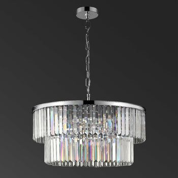 Bring undeniable star quality to your decor with this captivating Karissa Chandelier. Flaunting two cascading tiers of elongated crystal prisms beneath a sleek chrome-finished crown, Karissa's unapologetic Old Hollywood glamour instantly transforms any interior.