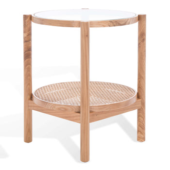 Enliven your home with the refreshing and airy design of our Karyna accent table. Our two-tiered accent table features a tempered glass top and elegantly weaved rattan base. The two surfaces are held together with slender elm wood cylindrical legs. Showcasing a sleek and unexpected textural mix, our accent table brightens up your home with its breezy and refreshing design. Both stylish and functional, the table lends an additional surface at the bottom to keep your essentials within easy reach.