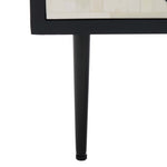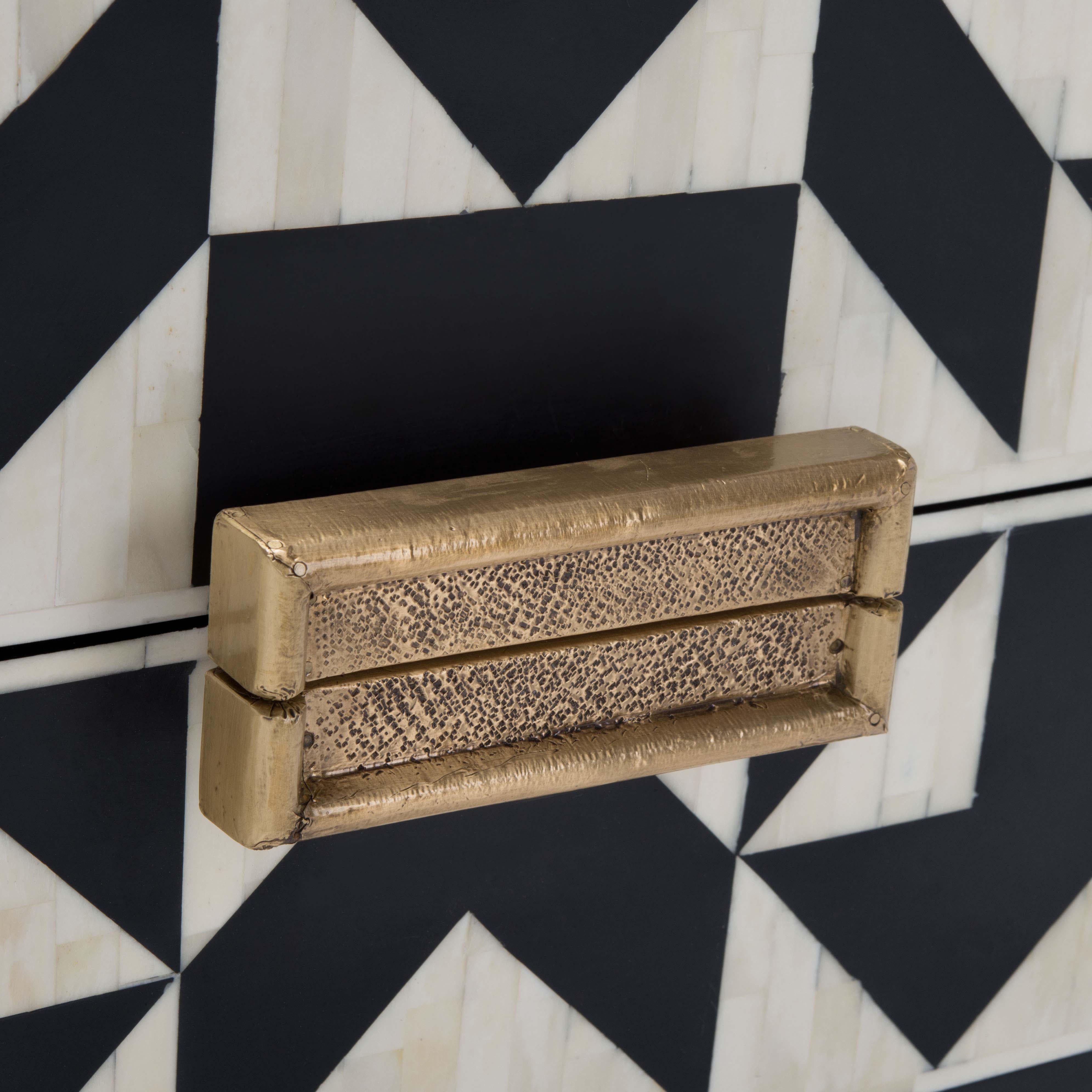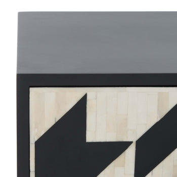 Undeniably breathtaking, this handmade Kimori Nightstand is absolute epitome of couturier penthouse chic. The organic striations of Kimori's natural white bone inlay are brilliantly juxtaposed against the stark angles of its black geometric accents, creating a stunning illusionary display. Gold accents complete the glamorous look.