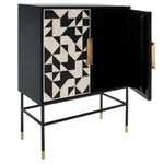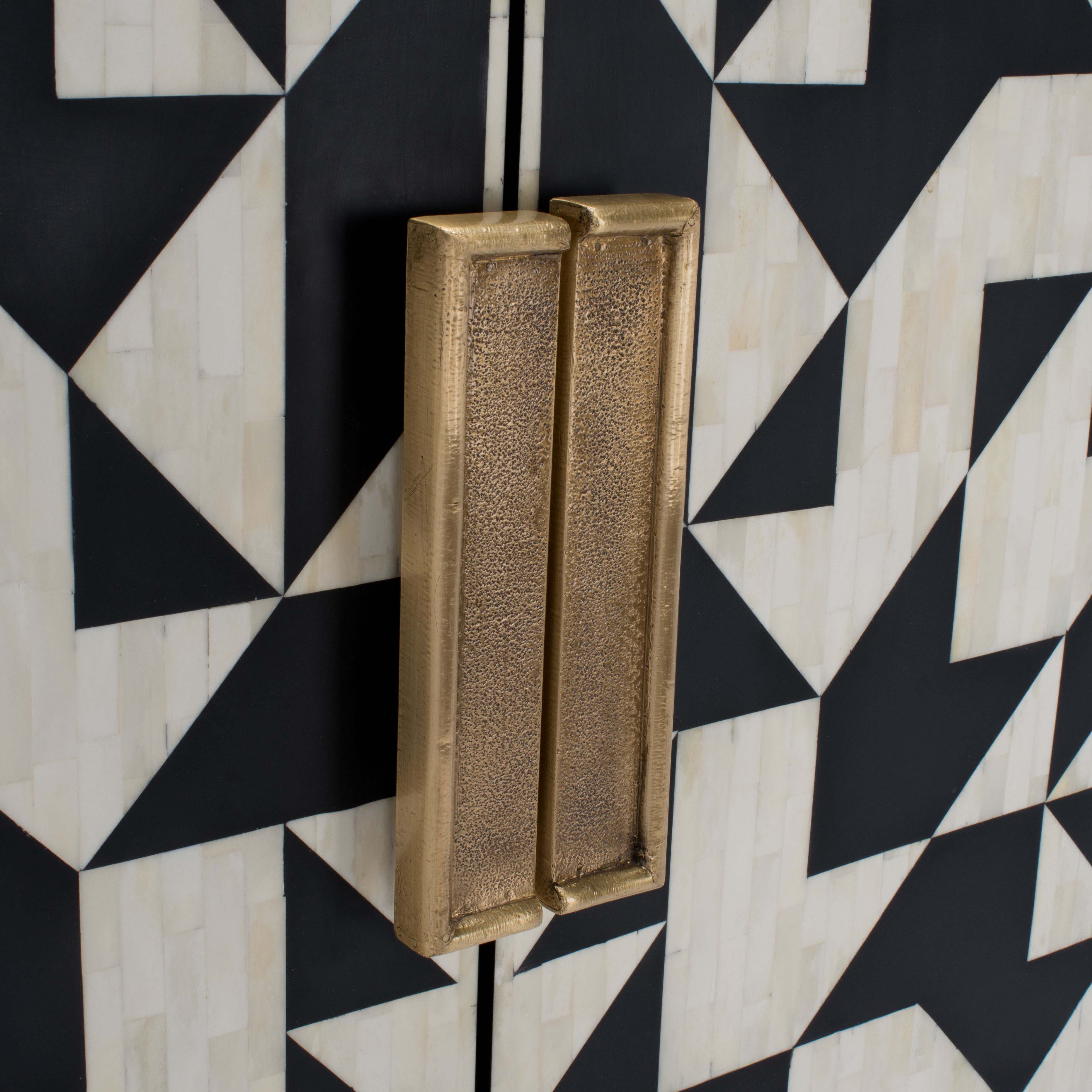 The absolute epitome of couturier penthouse chic, this handmade Kimori Bar Cabinet is undeniably breathtaking. The organic striations of Kimori's natural white bone inlay are brilliantly juxtaposed against the stark angles of its black geometric accents, creating a stunning illusionary display. Gold accents complete the glamorous look.