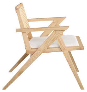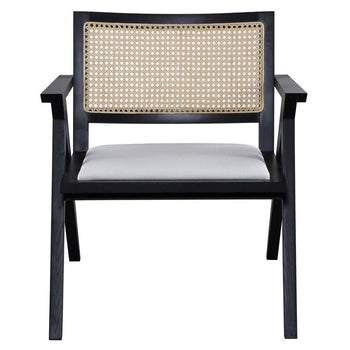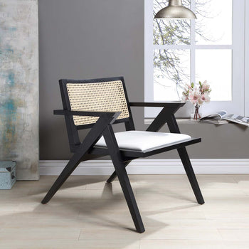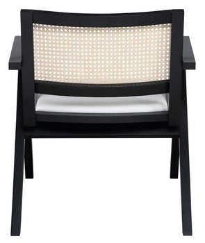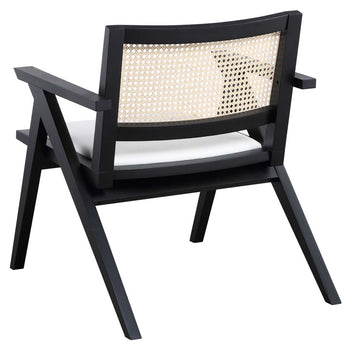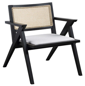 A modern coastal take on Mid-Century chic, this Krystine Accent Chair revitalizes any room with a rich sense of motion and stylish contemporary flair. Krystine's starkly angled black frame is given additional decorative depth with a natural rattan back, while its white linen cushion makes Krystine endlessly comfortable.