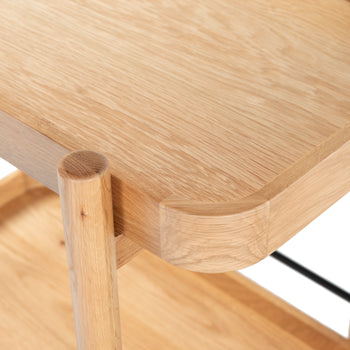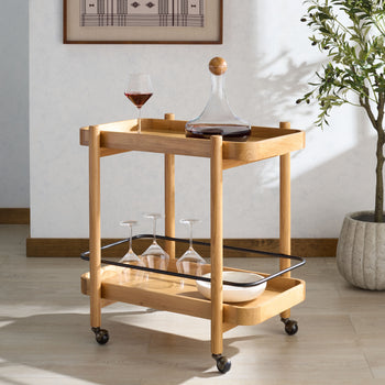 Introducing the KRYSTOF Wood 2 Shelf Barcart, a seamless blend of natural charm and modern sophistication. Crafted from a harmonious mix of wood and metal, this barcart adds a touch of elegance to your space. Its color effortlessly complements a variety of decor styles, making it a versatile addition to any setting. The KRYSTOF barcart features two roomy shelves that provide ample space to display your favorite beverages, glassware, and bar accessories. Whether you are hosting a gathering or enjoying a quiet evening, this barcart enhances the experience, keeping everything within easy reach. Built for both function and style, the KRYSTOF Wood 2 Shelf Barcart is an ideal choice for those who appreciate beautiful design and practicality. Elevate your home entertaining with this charming piece that effortlessly balances form and function. Create memorable moments and impress your guests with the KRYSTOF barcart, where timeless design meets modern flair.