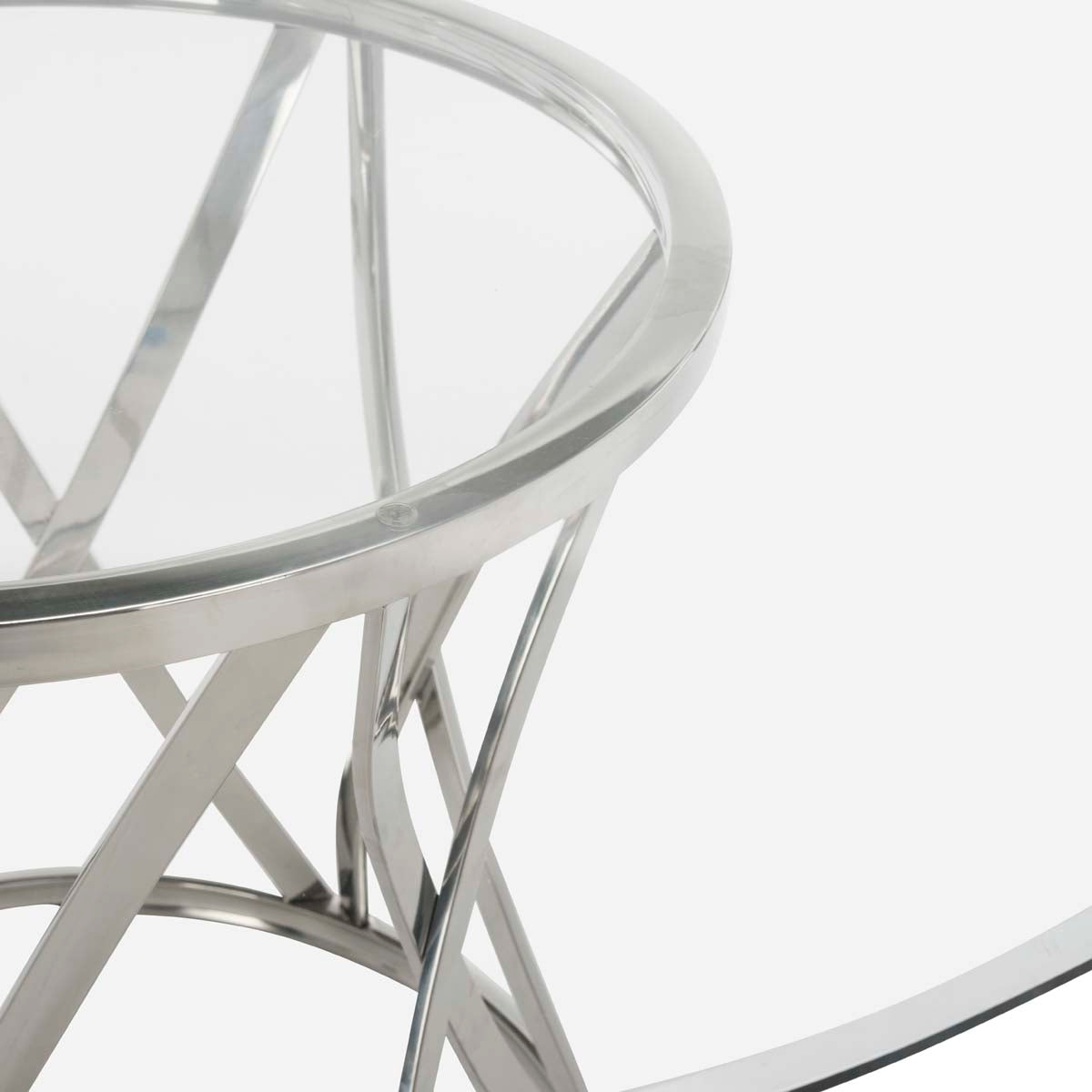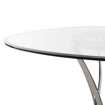 The Kyrie dining table was inspired by the inimitable style of design legends Charles and Ray Eames and Arne Jacobsen. This contemporary and glamorous spin on their classics features polished stainless steel and clear glass for the luxe modern abode.