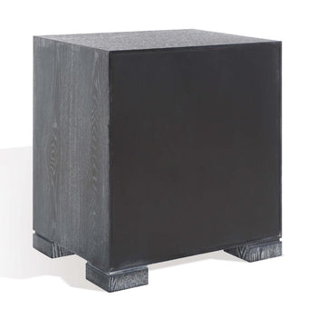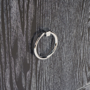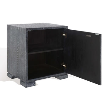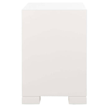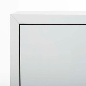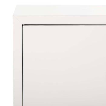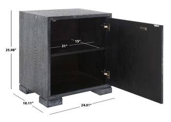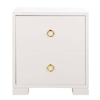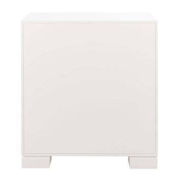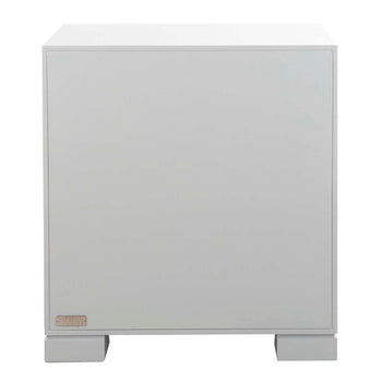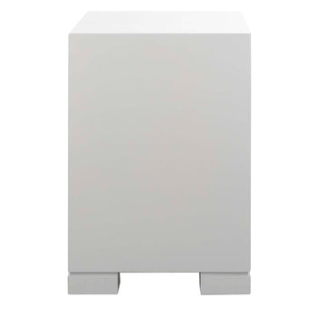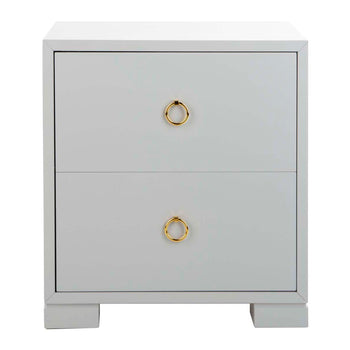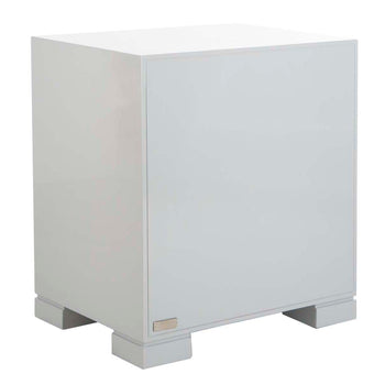 A clean lined transitional silhouette pops in a pretty lacquer finish of light grey in the versatile Laila chest. Adorned with brass hardware, a single door opens to reveal ample storage for essentials in a bedroom or living room.