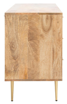 Bring modern artistry to the bedroom with this Leni Dresser. Leni brims with contemporary chic in the chevron brass inlay on two cement drawers, perfectly framed by four additional drawers in natural finished mango wood. Complementing brass tapered legs complete the look.