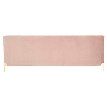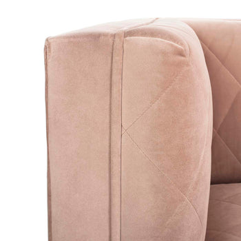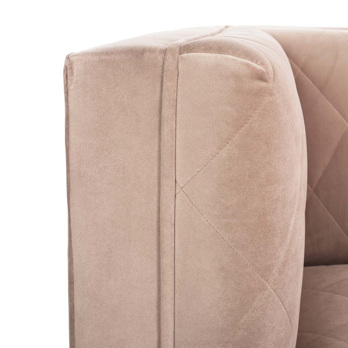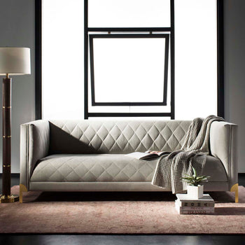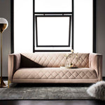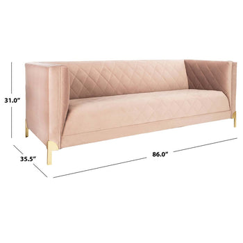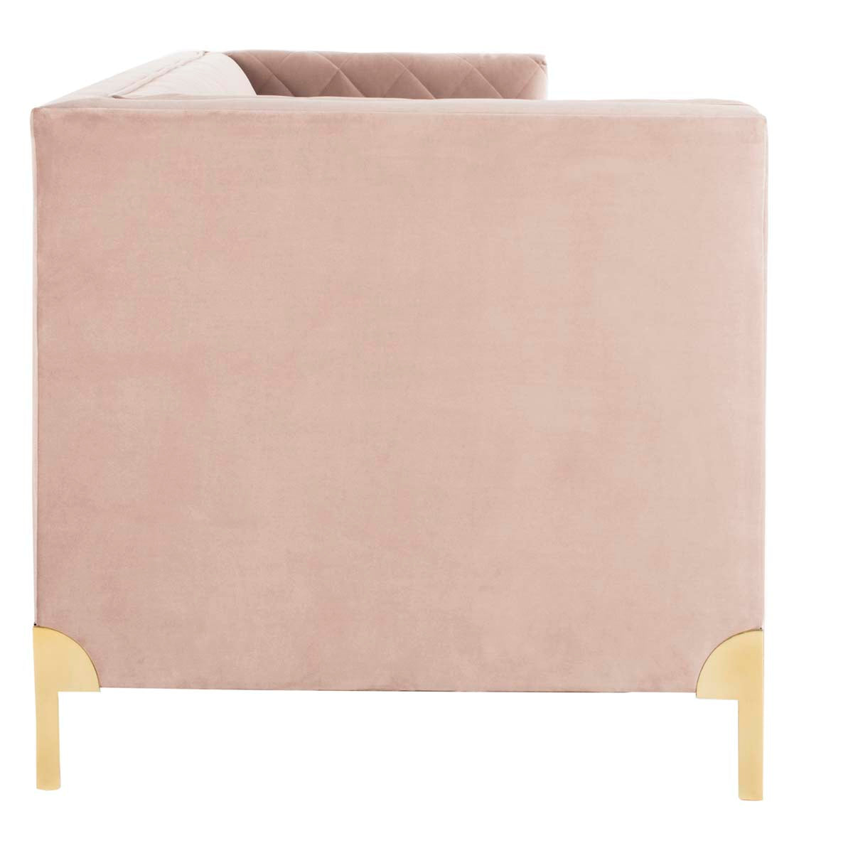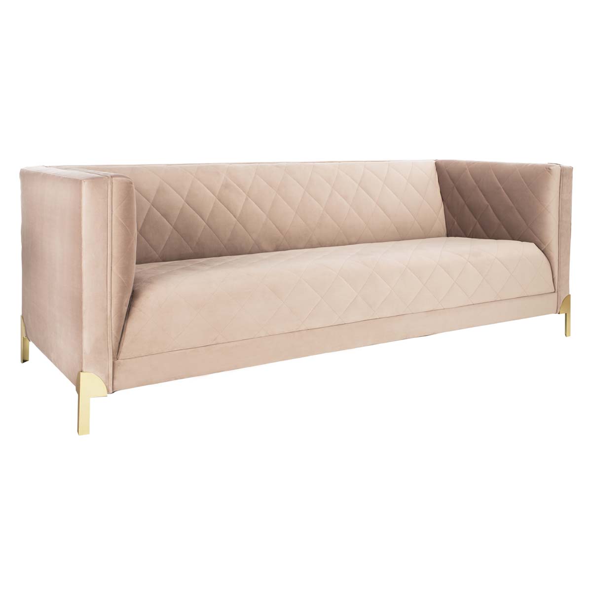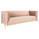 An oasis of serenity, this contemporary diamond trellis sofa brings high style and supreme comfort to the living room. Upholstered in a posh dusty rose hue with a subtle quilted pattern, its rich gold-finished metal legs add shine and dimensionality.