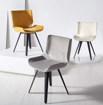 Boasting a Mid-Century Scandinavian look that designers are obsessed with, this handmade Matty Dining Chair brings retro-chic luxury to your decor. Dramatically splayed legs and cut-out side accents create a theatric silhouette that dares you to look away, and plush cream velvet upholstery puts Matty at the pinnacle of luxury.