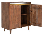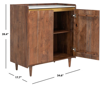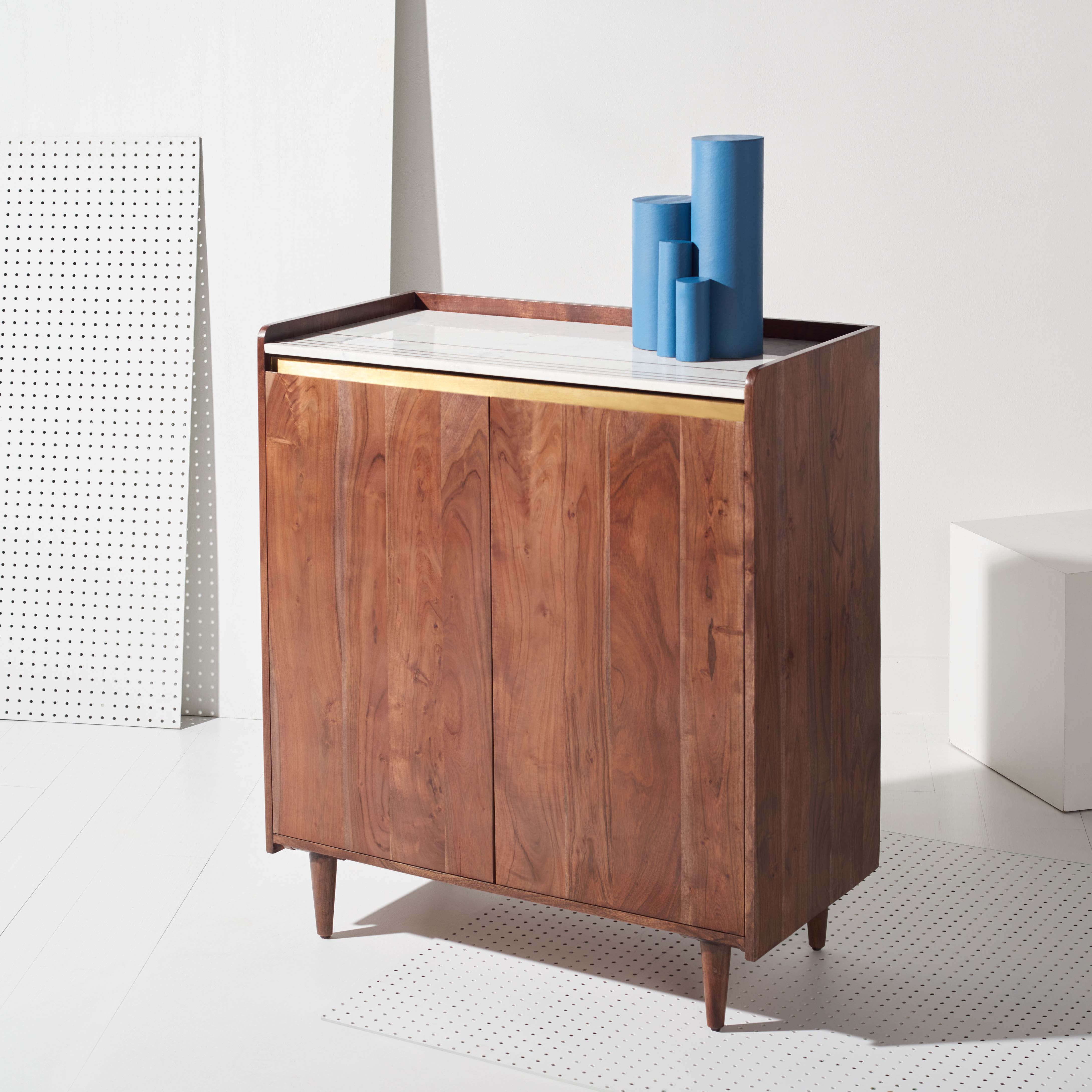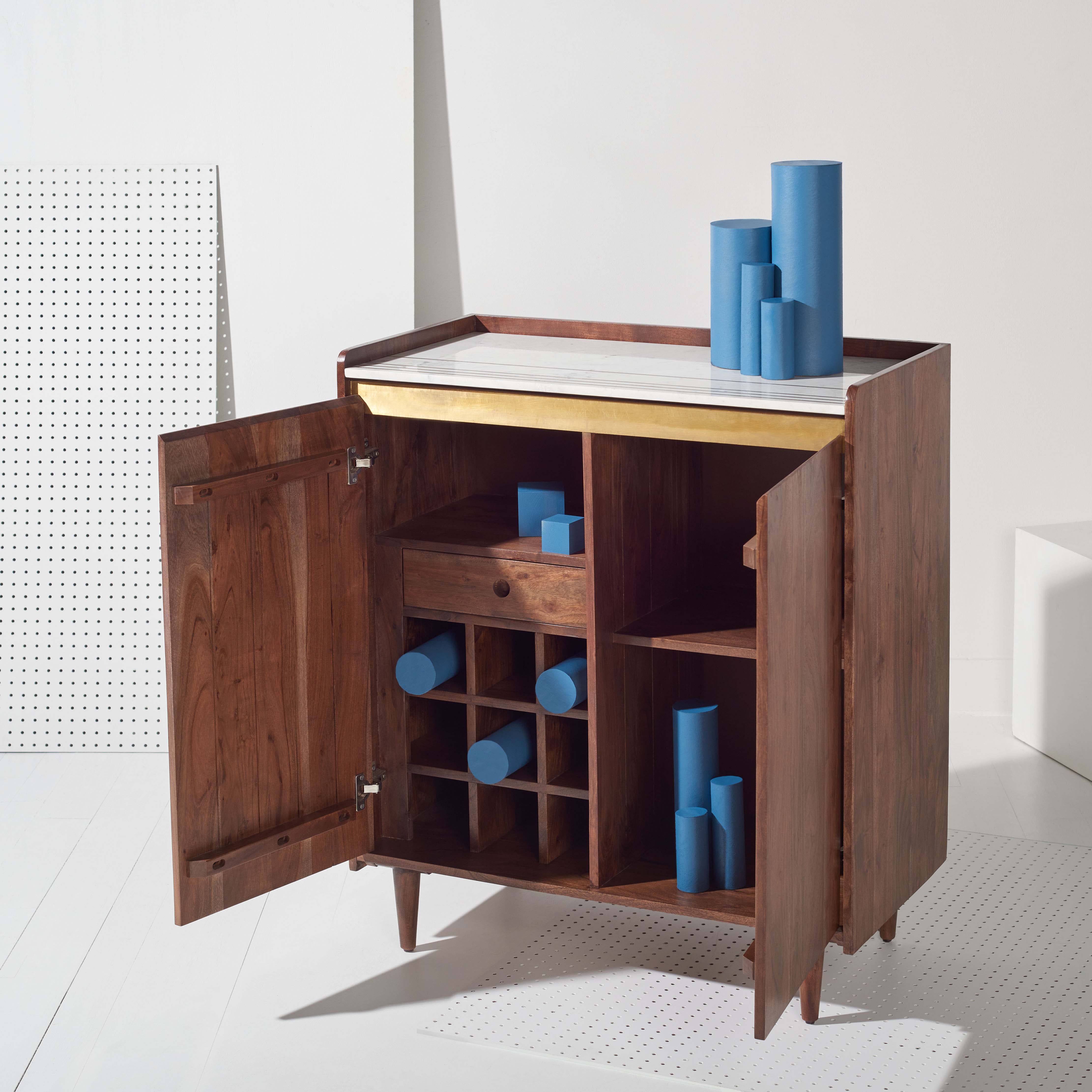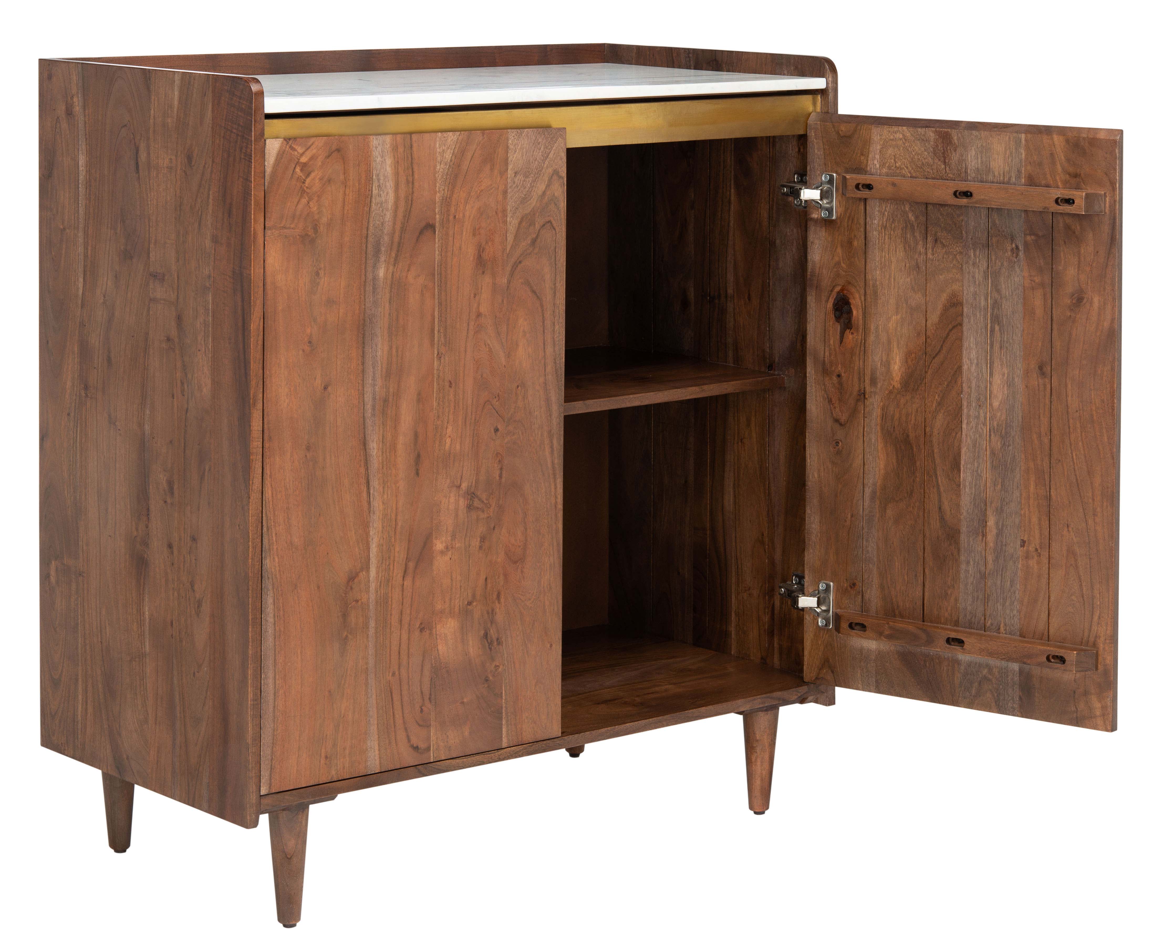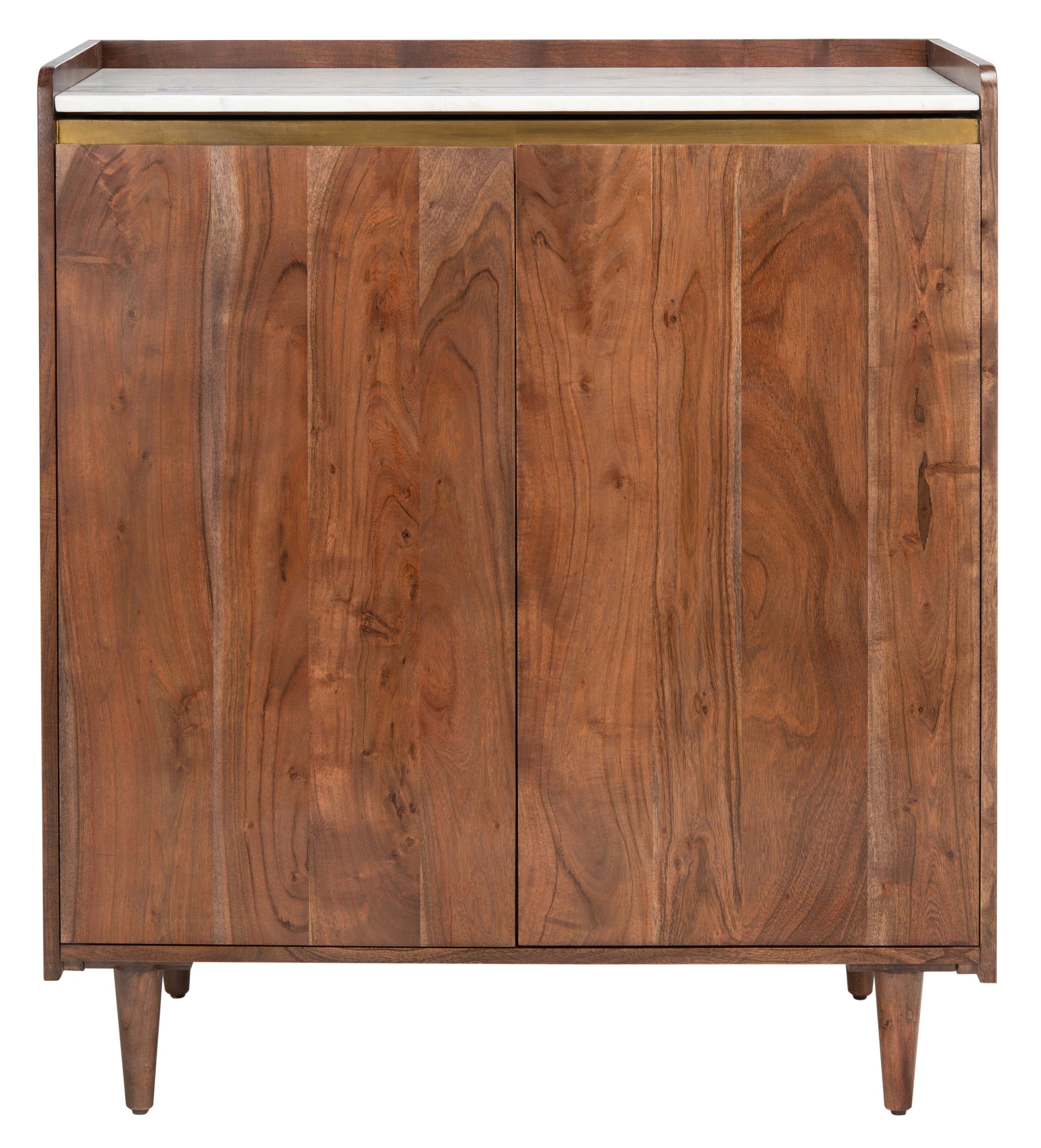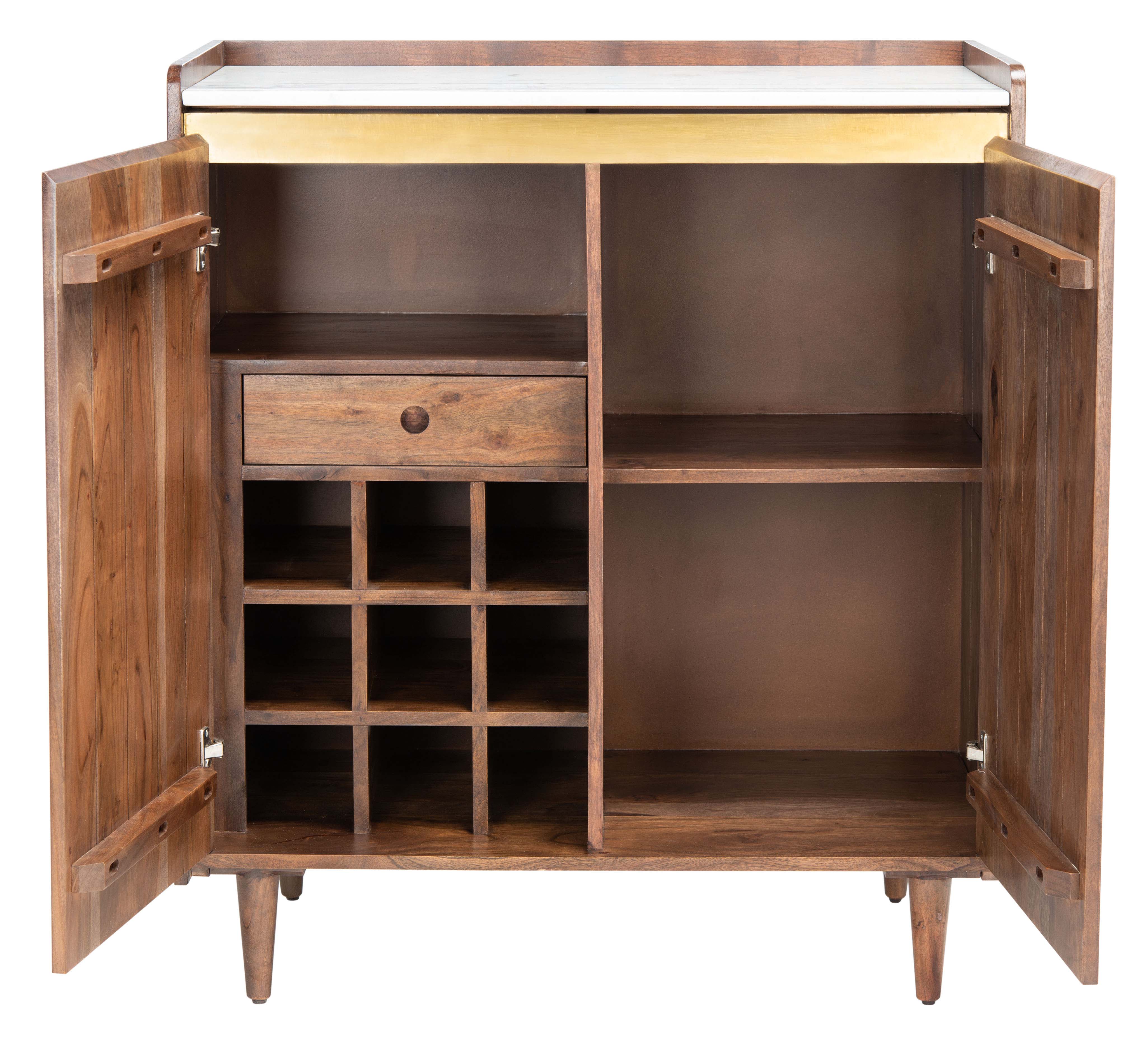 Bring classic contemporary charm to your entertainment space with this Milana Bar Cabinet. Milana?s warm walnut finish beautifully highlights its white marble top and shining brass accents, while two doors allow for discrete storage of cocktail ingredients or martini glasses.
