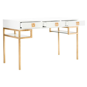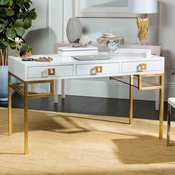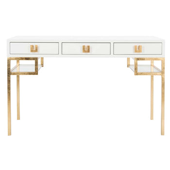 Embrace the fresh style of this contemporary Lacquer Writing Desk. The foundation of any modern office, its white lacquer finish is paired with gold leaf hardware for timeless elan. Designers love its ample three drawer storage and sleek glass shelves.