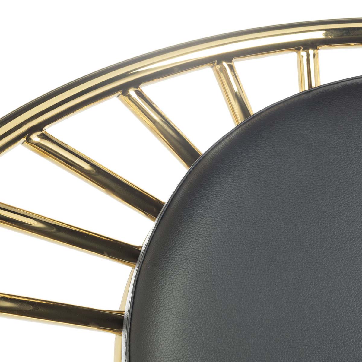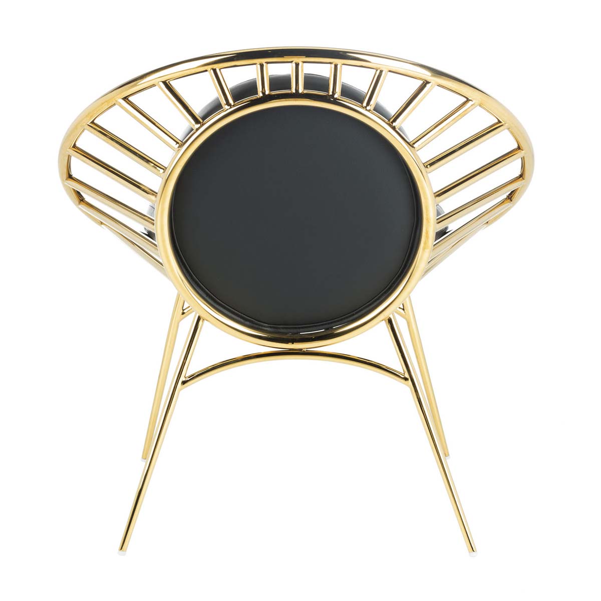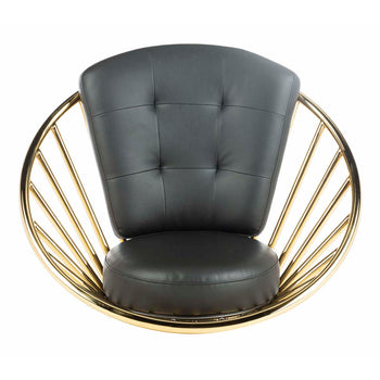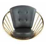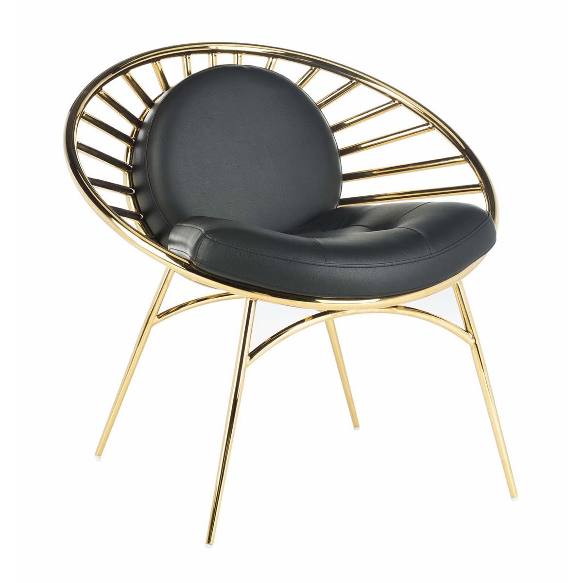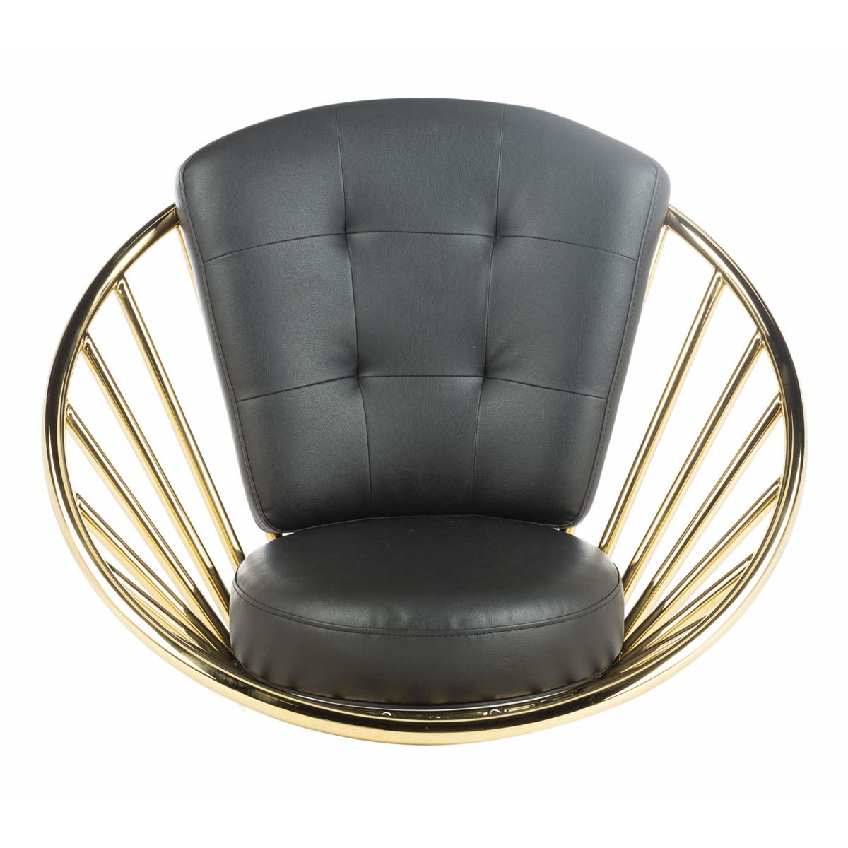 Dramatic and bold, this lavish contemporary hoop chair makes an unforgettable statement in any living room. Its stunning radiant gold and brass finishes illuminate its luxurious wood craftsmanship and its generously upholstered chic black cushions.