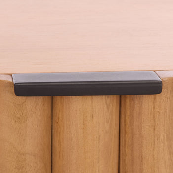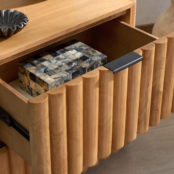 Introducing the Renata Fluted Wood Nightstand! This sleek, stylish piece will instantly upgrade your bedroom decor. Designed with a natural color, it complements any style or color scheme, while its mango wood and veneer craftsmanship give it a warm, inviting look. Whether you need a place to keep your books, glasses or other essentials, this nightstand is an ideal solution. For added convenience, it also comes with durable iron fittings to ensure its stability. With the Renata Fluted Wood Nightstand, you're not just buying a piece of furniture, you're investing in an elegant addition to your home.