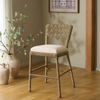 Enhance your home with the rosemarie woven seagrass counter stool in natural beige. This stool beautifully combines style and function, making it a great choice for any kitchen or dining area. The natural tones of the stool blend seamlessly with a variety of interior styles, offering a warm and inviting atmosphere. Crafted from a thoughtful mix of materials, the stool features a sturdy metal frame, making up 45 percent of its structure, while offering a distinct and organic appeal with 40 percent seagrass. The subtle hints of wood, fabric, and foam contribute to its comfortable and balanced design, creating an inviting place to sit and enjoy good company. With its comfortable seat and hearty build, the stool invites family and friends to gather around for meals and conversation, adding a touch of charm to your daily routine. Whether you're enjoying a quiet breakfast or hosting an evening gathering, this stool stands as a testament to simple elegance and timeless design.