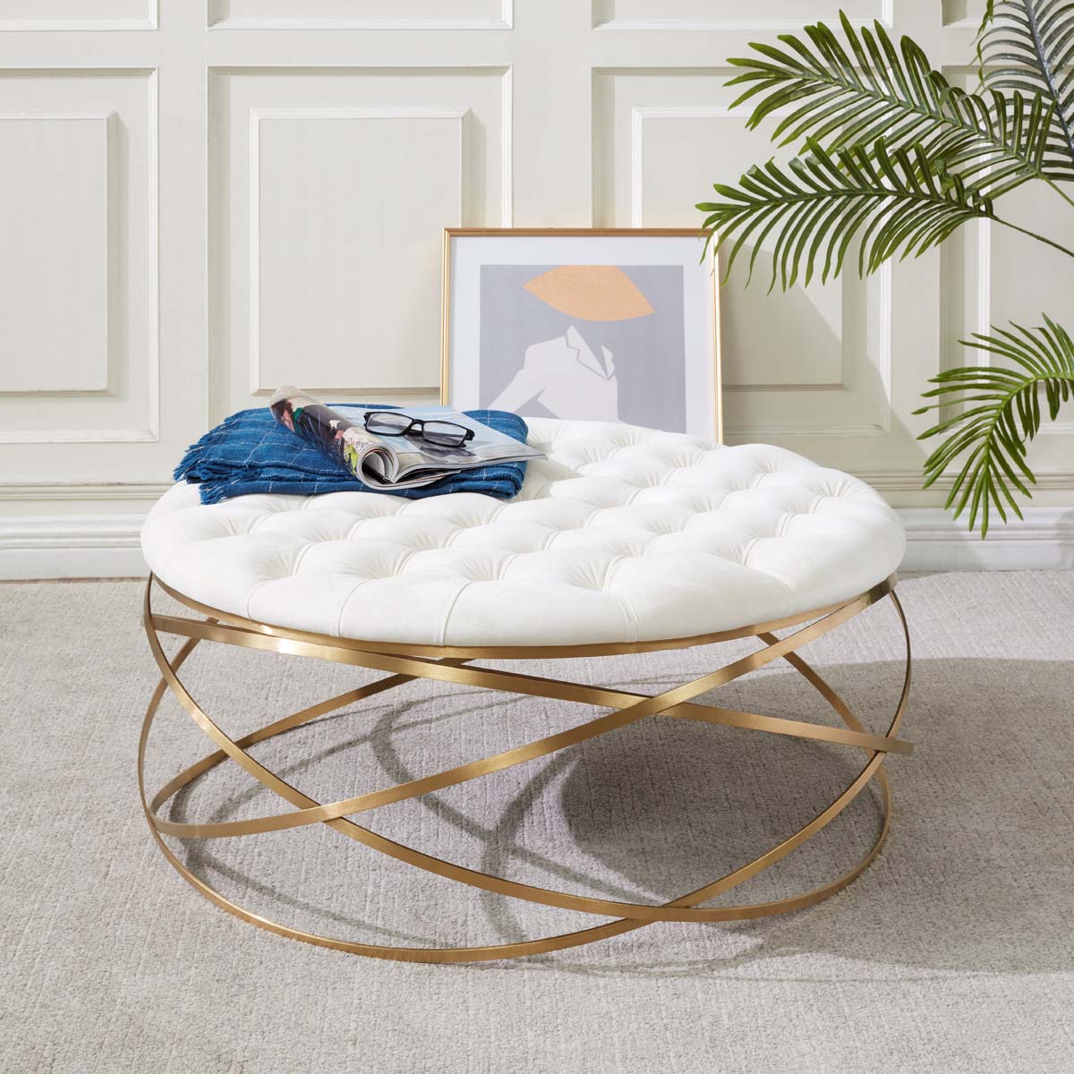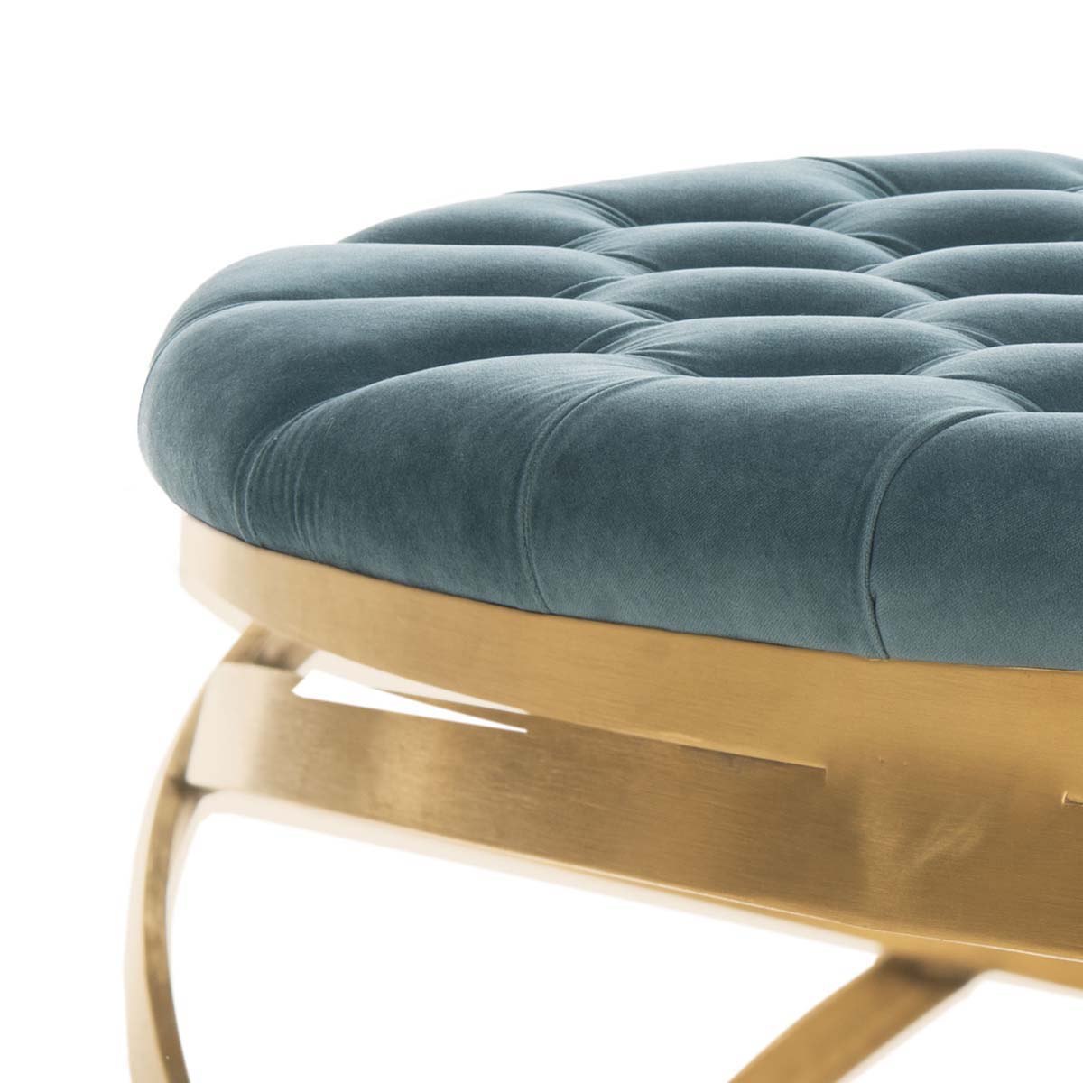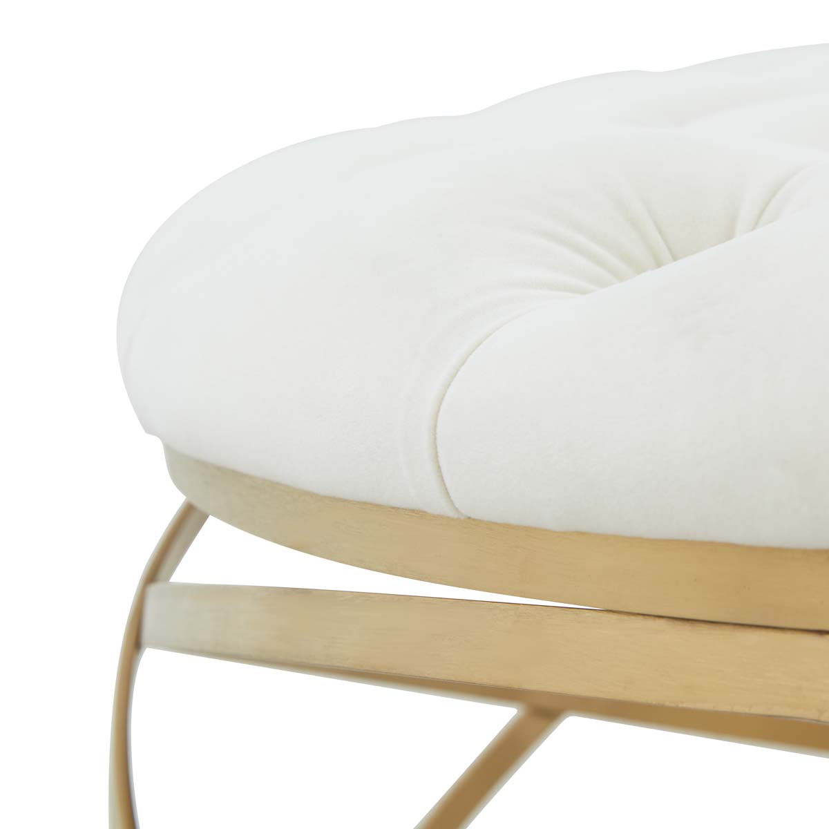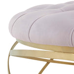 The focal point in any sophisticated interior, this contemporary velvet tufted ottoman is a timeless investment. Its classic navy hue and sculptural gold legs add artistic flair to the modern living room or bedroom.