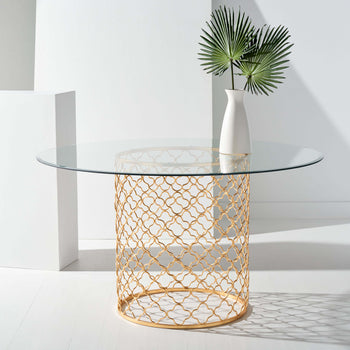Old World class meets glamorous modern chic in this stunning Sandrarose Dining Table. Showcasing an open quatrefoil trellis pedestal base in a shimmering gold finish, Sandrarose expertly heightens the aesthetic elegance of any high-fashion dining area.