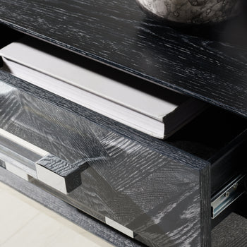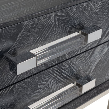 Elevate your space with the Sanford walnut two-drawer side table. This piece combines the natural allure of walnut with a sleek grey finish and elegant brass accents, creating a stunning addition to any room. The lucite handles add a modern touch, blending seamlessly with the sophisticated design.