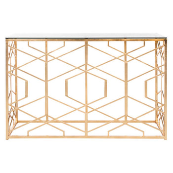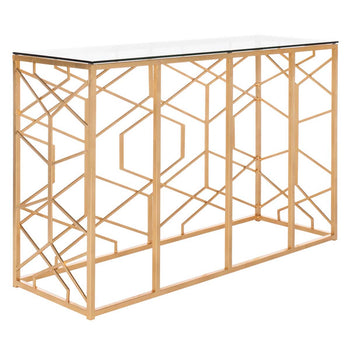 A glamorous centerpiece in any hall, entryway, or living room, this Sean Console Table makes a bold yet elegant statement. Sean shimmers with kaleidoscopic geometry in its open overlapping hexagonal frame, and a gold leaf finish is absolutely decadent.