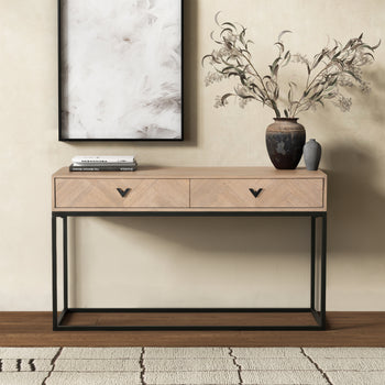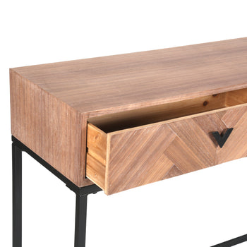 Introducing the Sherriandra 2 Drawer Wood and Metal Console Table, a perfect blend of wood and sleek black metal that complements any decor. This versatile piece effortlessly combines function and style, making it an ideal addition to your living room, hallway, or entryway. The warm finish highlights the beauty of the wood grain, while the black metal accents add a touch of modern elegance. The console table features two spacious drawers, providing ample space for storing keys, mail, and other essentials while keeping your space tidy and organized. Its sturdy construction ensures stability, making it not just a decorative piece but also a functional furniture item.