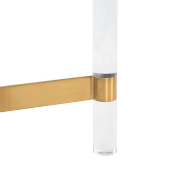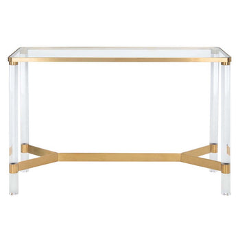 Revel in the good life with this refined yet extravagantly haute Suzanna Console Table. Crystal clear glass and acrylic recreate the glam seventies style for today's contemporary interiors while brass accents give a cosmopolitan shine.