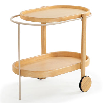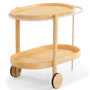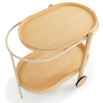 Introducing a captivating blend of style and functionality: the Trianna Wood Oval 2 Shelf Bar Cart in a delightful Natural finish. Crafted entirely from wood, this bar cart adds a touch of rustic elegance to any home or entertainment space. Its oval design is not just unique but also offers generous surface area, perfect for showcasing and serving your favorite drinks and hors doeuvres.
