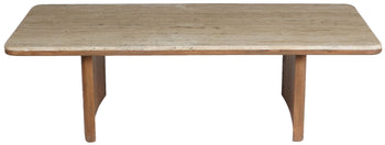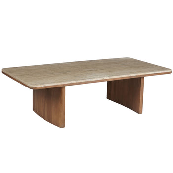 Enliven your space with the organic elegance and charm of our Trinsly coffee table. The bold and sculptural profile of our coffee table puts the beauty of natural materials on full display. Its travertine top celebrates the natural distress marks and earthy hues of the material. The thick-cut legs softly curve to bring out the dramatic character of acacia wood. Set to make a bold and eye-catching impact, our coffee table creates a stunning anchor for your lounge, bedroom, or home office. It provides ample space to display your favorite decor items and accessories.