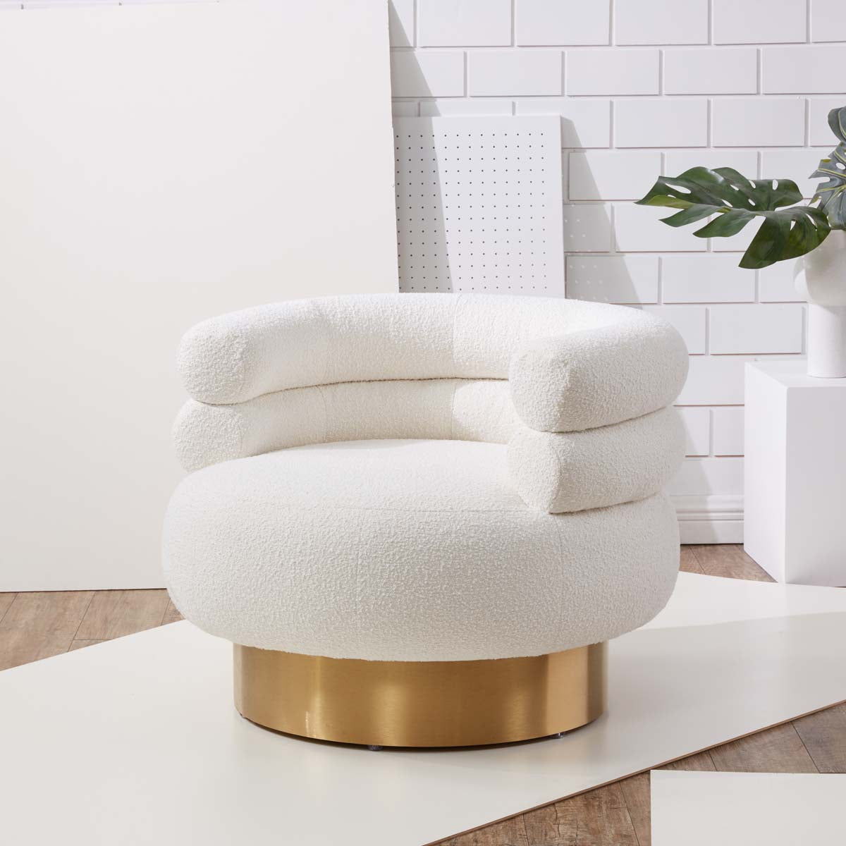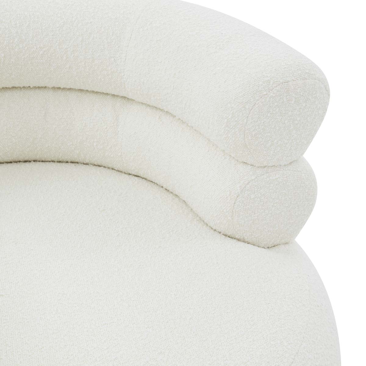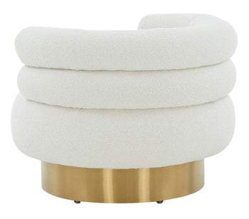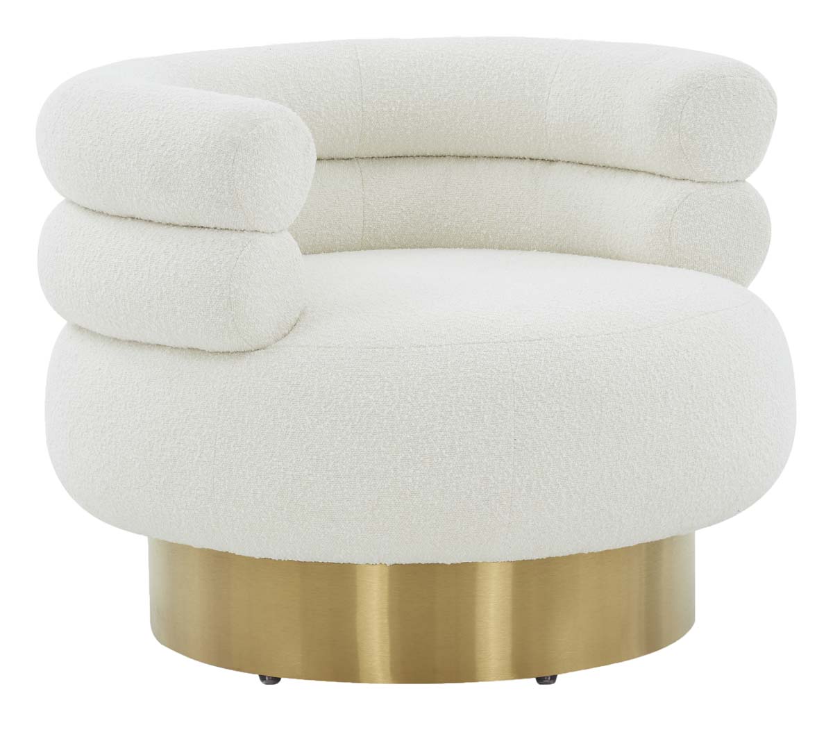 Embrace the plush and sculptural presence of our Wendell swivel chair. The barrel back of the accent chair sculpts into a gracefully curved and rounded back. A sculptural work of art, our accent chair can enliven any corner with a dose of grace and elegance. Its round back envelopes you while the generously padded seat offers a comfy rest. A perfect spot to nestle in, our ivory-colored chair combines a swivel function to attain a 360-degree view of the room.