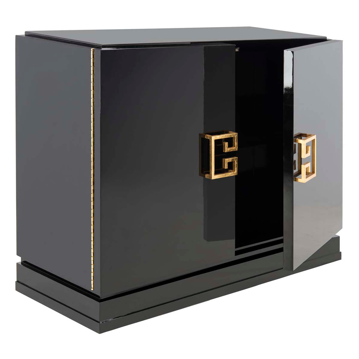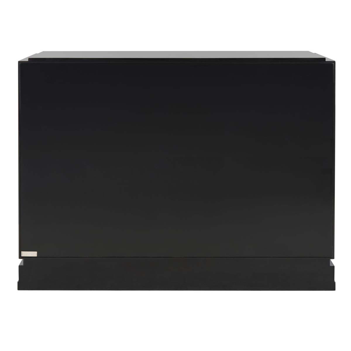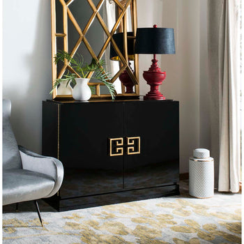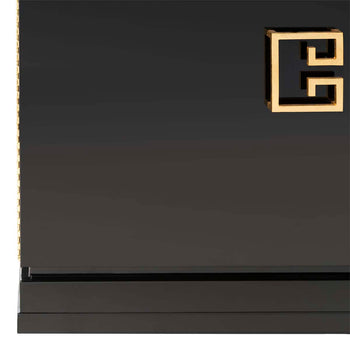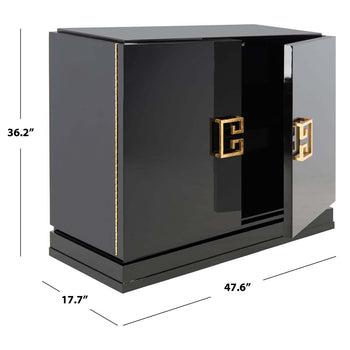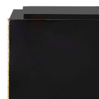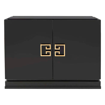 Referencing Chinese modern style, the black lacquer Winslow two drawer cabinet combines glamorous design with important storage space in a living room or bedroom. The cabinet is artfully crafted of wood with gold leafed hardware in a classic Asia motif.