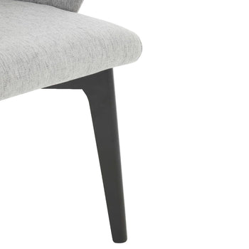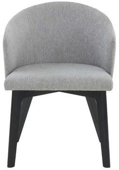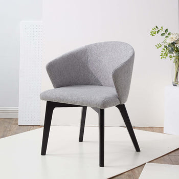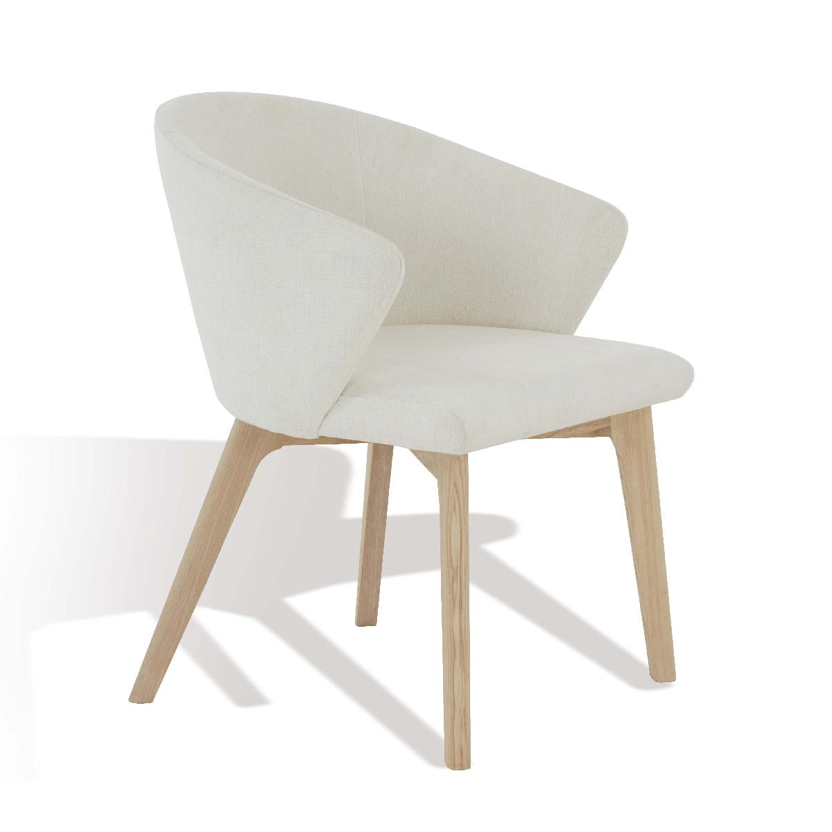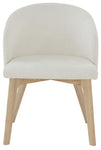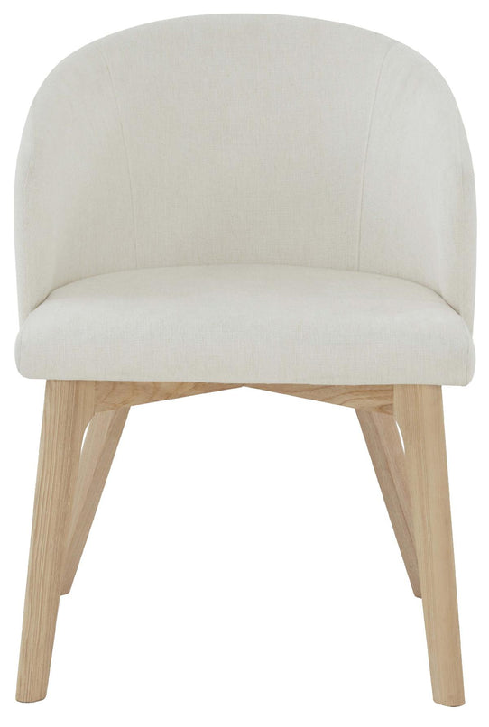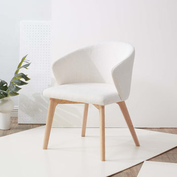 Sink in the high-end comfort and style of our Wynonna dining chair. It streamlines a barrel back to vouch for a sculptural and inviting silhouette. The seamlessly flowing arms and back, and a generously padded seat envelope you in comfort. Our modern chair is warmed up with tapered pinewood legs. It is upholstered in a classy ivory shade in high-quality linen. A perfect blend of style and functionality, the chair offers a comfortable dining experience.