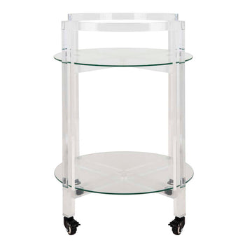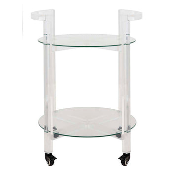 Designed for the gracious host, this luxurious 2 tier contemporary acrylic bar cart blends into any decor. Its two generous clear glass tiers and acrylic frame are ideal for displaying glassware, tableware, canapes and favorite ingredients for imbibing.