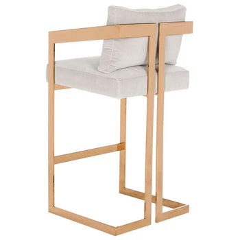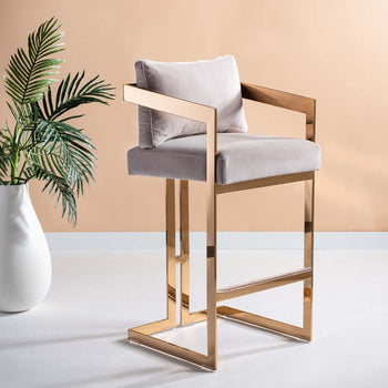 The Taraji Barstool was designed for the contemporary tastemaker. Its gentle angles finished in a gold metallic hue shimmer alongside the indulgent almond velvet upholstery. Ideal for interiors that invite city living at its finest.