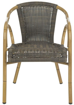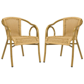 Retro chic style defines the set of two Dagny indoor outdoor arm chairs by Safavieh. With aluminum frame finished and molded to create the look of bamboo, these pretty and practical chairs feature intricate wicker seat and back in a natural hue.