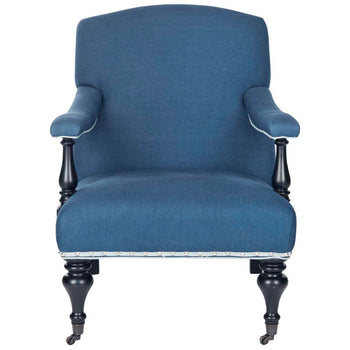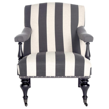 A modern take on a country English piece, the Devona Arm Chair features a classic curved back and open upholstered arms for a light, airy feel. The linen is accented with silver nail heads and black birch legs for a glamorous new look.