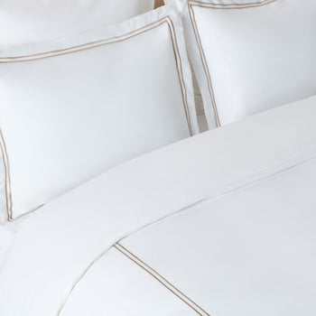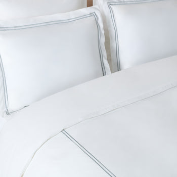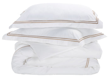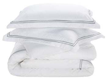Introducing the Hotel Collection 2-Line Embroidered Duvet Cover Set, a refined blend of elegance and comfort for your bedroom sanctuary. Crafted from 100% cotton with a crisp 300-thread count percale shell, this luxurious bedding set delivers both softness and sophistication. The duvet cover features a clean base, beautifully accented with tasteful two-line embroidery, adding a luminous touch of timeless charm to any decor.