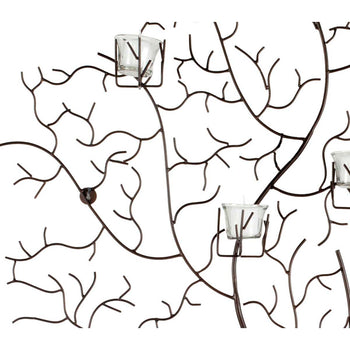 This graceful, tree inspired, wall mounted piece will add a relaxing organic vibe to any room. Carefully wrought from iron, it holds ten glass cups to accommodate votive candles.