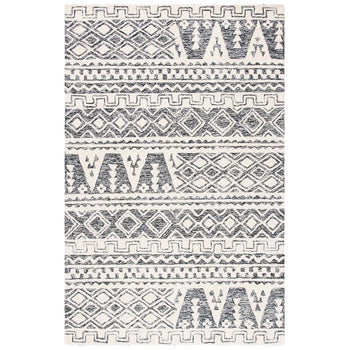 Elevate your living space with the exquisite charm of our 5' X 8' medium rectangle area rug, designed to effortlessly blend with contemporary decor. Crafted in India through the skillful hand-tufted technique, this rug boasts a robust wool construction, promising both comfort and durability. Its captivating ivory and black hues are artfully intertwined in a mesmerizing pattern featuring tribal-inspired motifs that invoke a sense of worldly sophistication. Standing with a plush height of 5/8", this piece encapsulates luxury underfoot. Please note, to preserve its beauty, this rug is not washable and does not feature slip resistance. It is a statement of fine craftsmanship and modern aesthetic that will anchor your room with its bold and graphic presence.