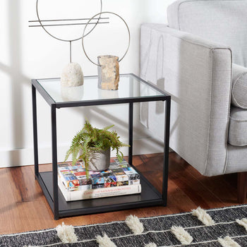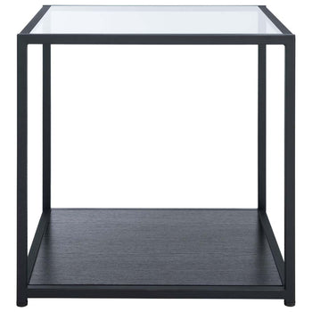 A favorite of contemporary designers, this Ackley End Table is effortlessly styled to suit any room's Decor scheme. Ackley's understated open black frame is perfectly paired with a sleek glass top, and its bottom shelf provides ample space for storage or display.