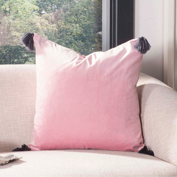 High fashion meets uptown flair in this Adelina Accent Pillow, flaunting a playful, pastel pink, perfectly accented with posh, black tassels. Stylish and fun, Adelina easily brightens any space with its cute charm. Includes a handy zipper on back for easy access cleaning.