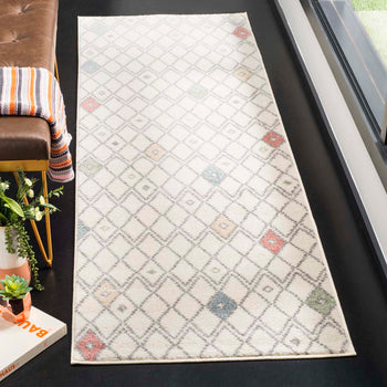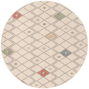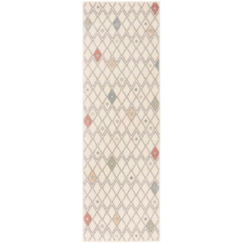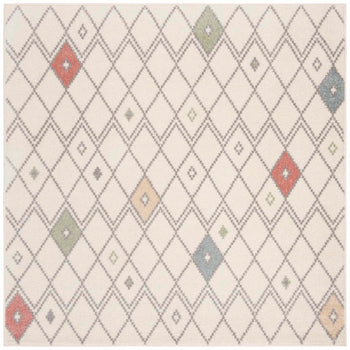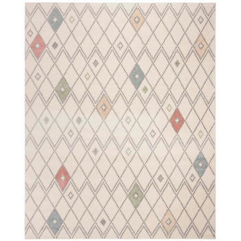 Constructed with durability in mind, the rug is made from a blend of 55% Polypropylene, 40% Jute, and 5% Polyester, ensuring both softness and resilience. The geometric diamond motif, adorned with occasional pops of color, adds a playful yet sophisticated touch to your decor.