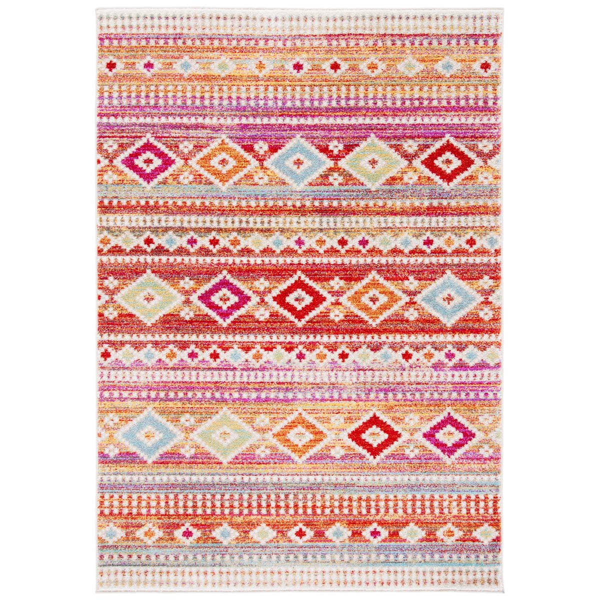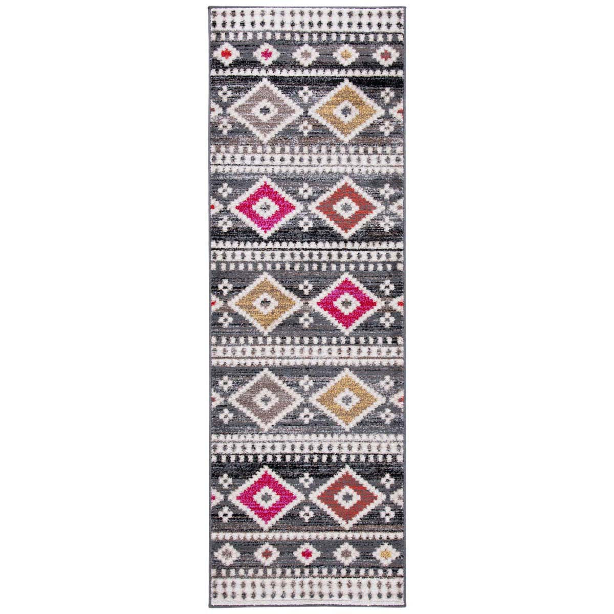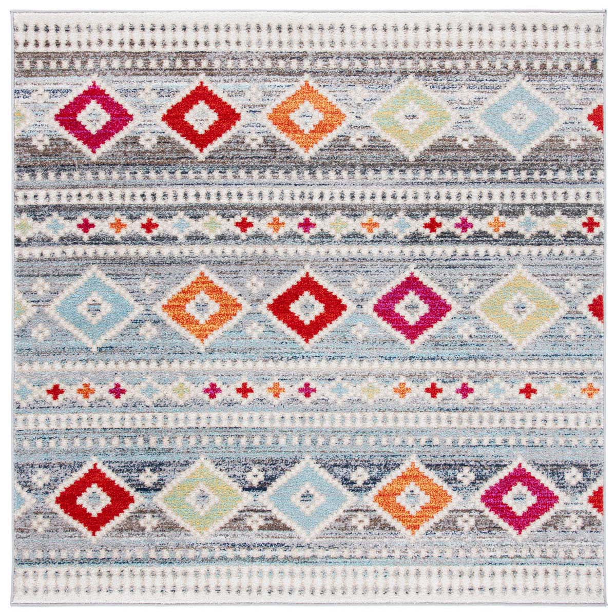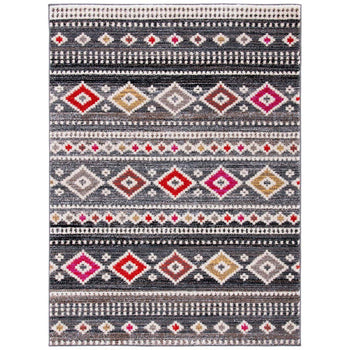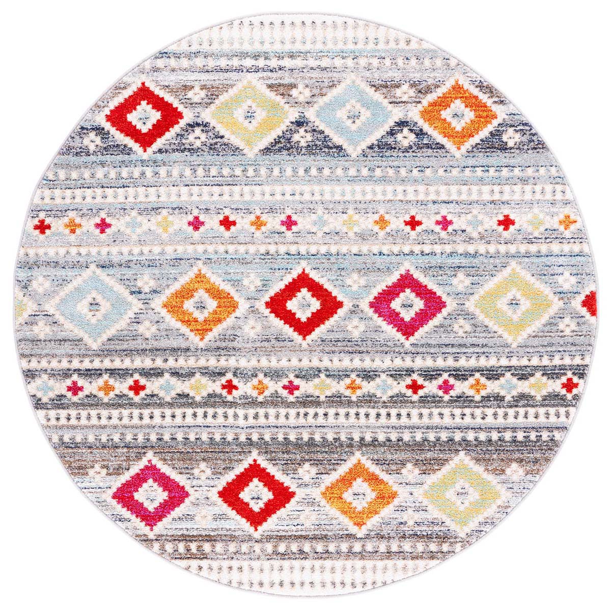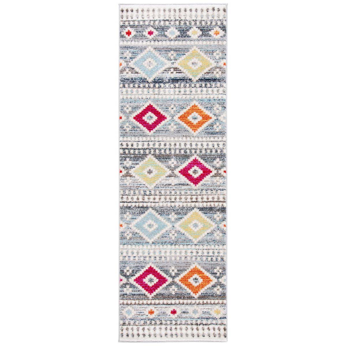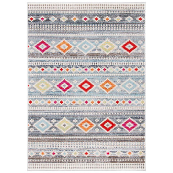 Enrich your living space with this OEKO-TEX certified rug, which guarantees that it's free from harmful substances. The tasteful light grey and ivory hues provide a versatile foundation for your decor, while the vibrant pattern features an array of geometric motifs and a playful mix of accent colors, adding a touch of elegance and charm to any room.