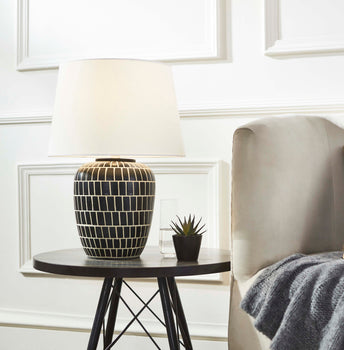 Beautifully showcasing an etched mosaic design evocative of ancient tilework, this Aela Table Lamp is a modern masterpiece. Aela's textured black ceramic perfectly showcases its intricate details, and an empire shade completes the look.