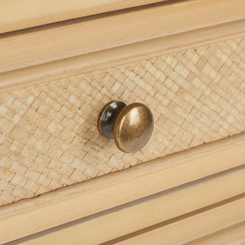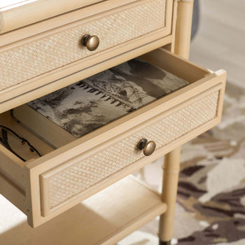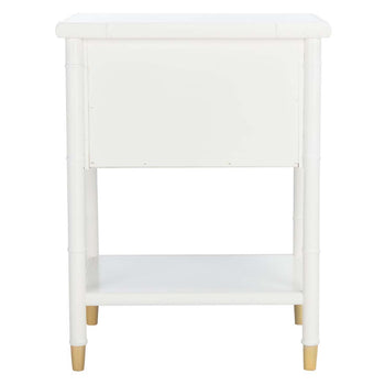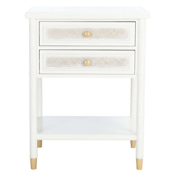 Give any room a touch of Chinoiserie-chic finery with this stunning Ahab Accent Table. Ahab's bamboo-style frame is given a glamorous upgrade in a glossy white finish, and the textural details on its two drawers and side panels make a bold modern statement. Gold steel pulls and caps elevate its aesthetic prowess.