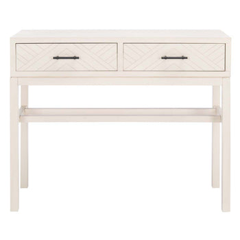 This Ajana Console is a marvelous m'slange of modern minimalism and abstract art. Ajana's clean lined Parson's frame in distressed white is beautifully offset by the honey brown herringbone inspired chevron pattern on its two drawers.