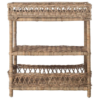 Storage with style is embodied in a natural rattan three tier accent table designed to adapt to any interior theme, from coastal cottage to rustic lodge. Crafted by master weavers of lacak rattan, this chic rack is as useful in the bathroom as in a living room.