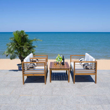 Lounge in style in every season with this luxurious 4 piece outdoor living set. Outfitted with sumptuous beige cushions, its expansive traditional sofa and two classic arm chairs are perfect for entertaining around its beautiful natural acacia wood table.