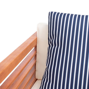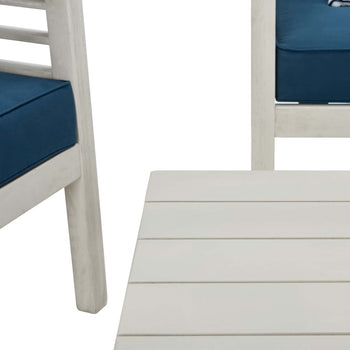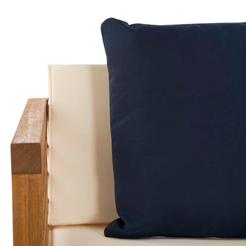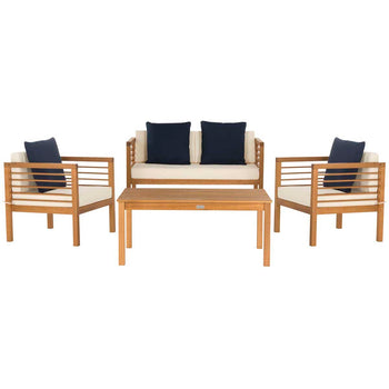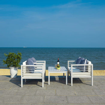 Inspired by Barcelona's coastal style, this contemporary 4 piece outdoor set is a new classic. Designed with chic clean lines, each piece is crafted in a neutral natural hue and upholstered in white for timeless appeal. Its bold navy accent pillows are complementary.