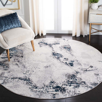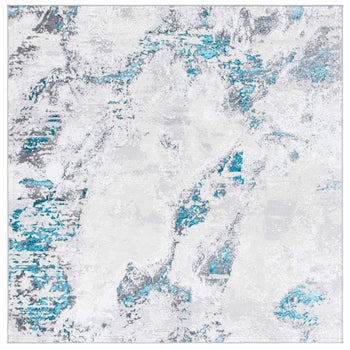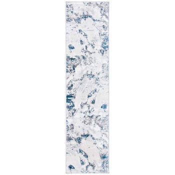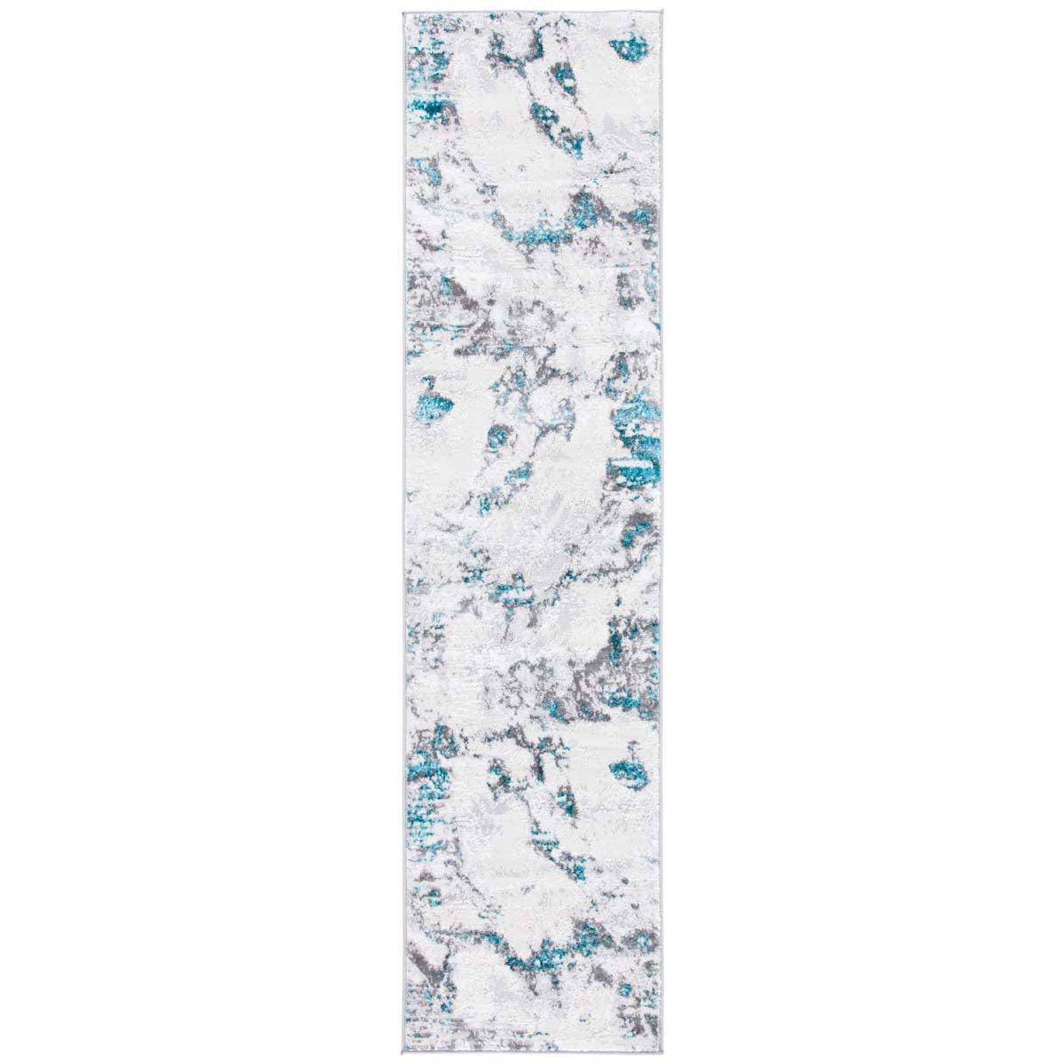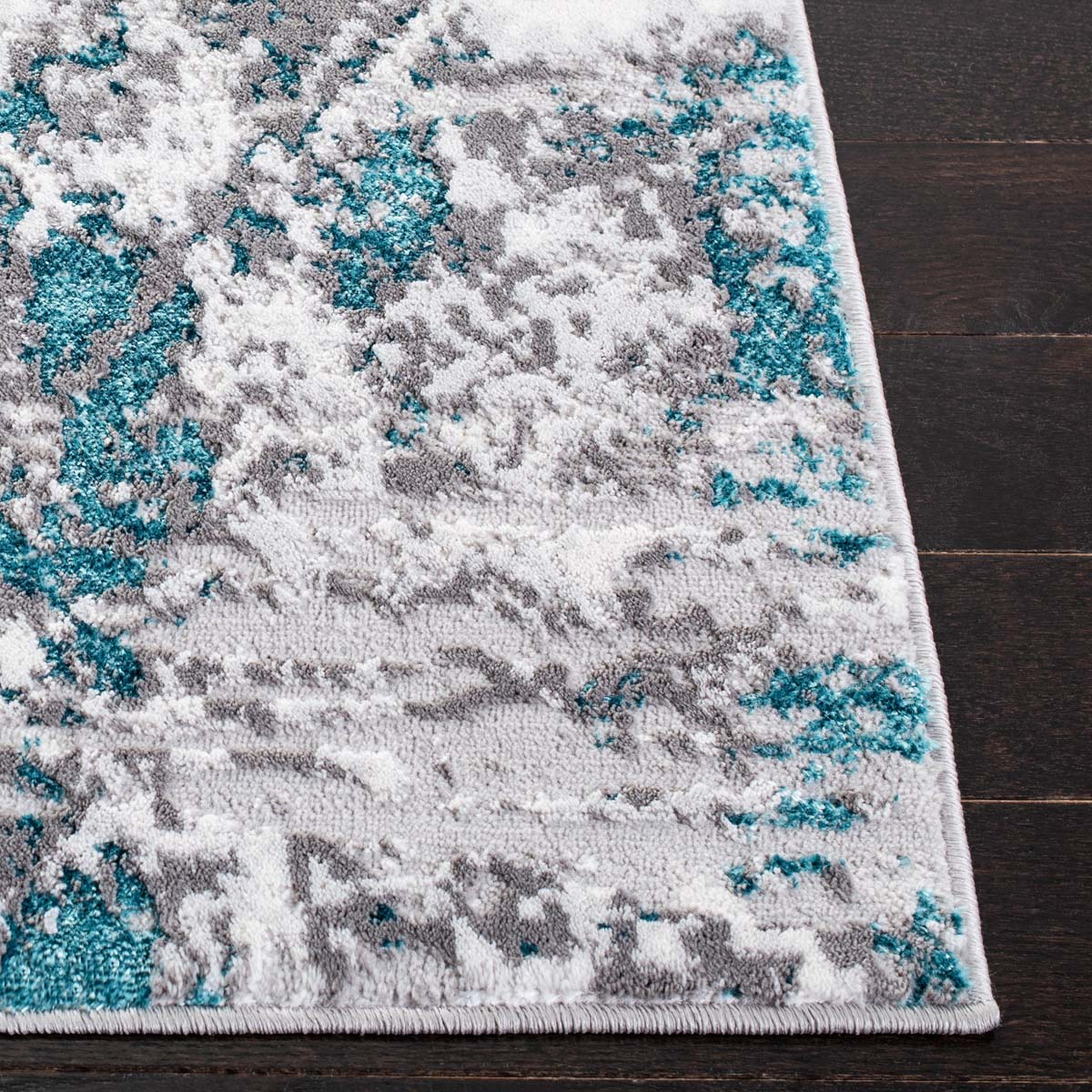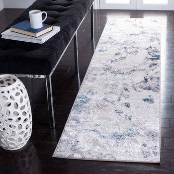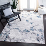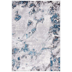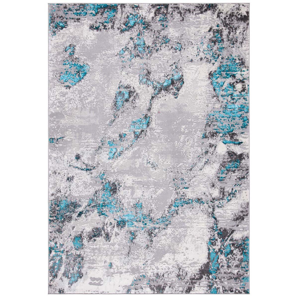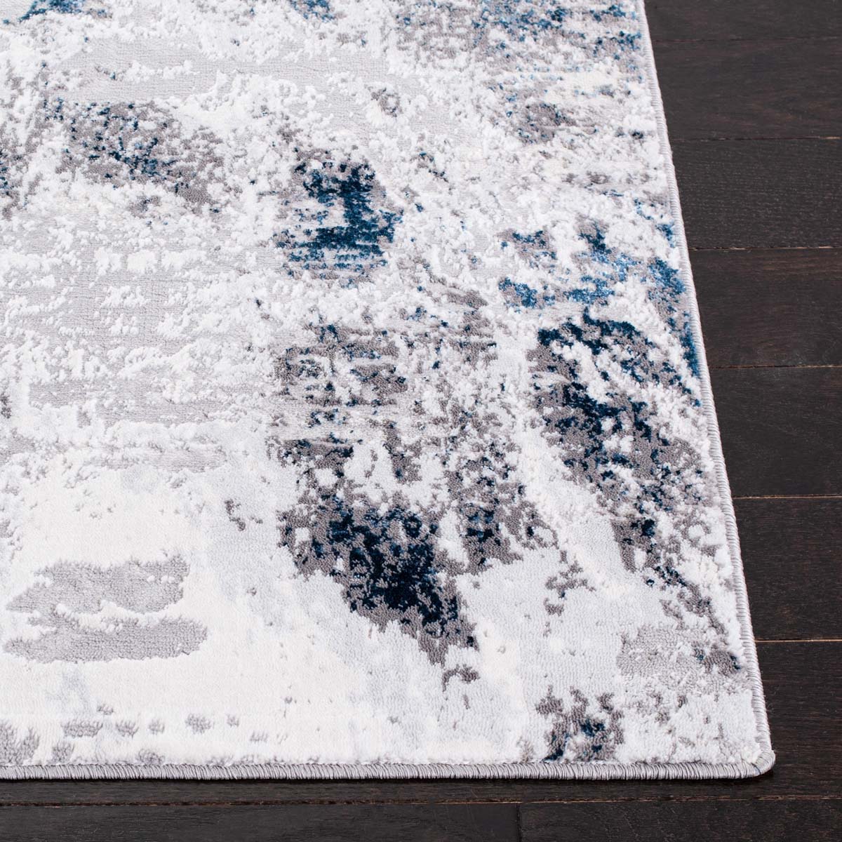 The rug pattern features an abstract mix of grey hues with vivid blue accents that create a dynamic and visually striking appearance. The design embodies a blend of artistry and sophistication that will capture attention and seamlessly integrate into a contemporary decor theme.