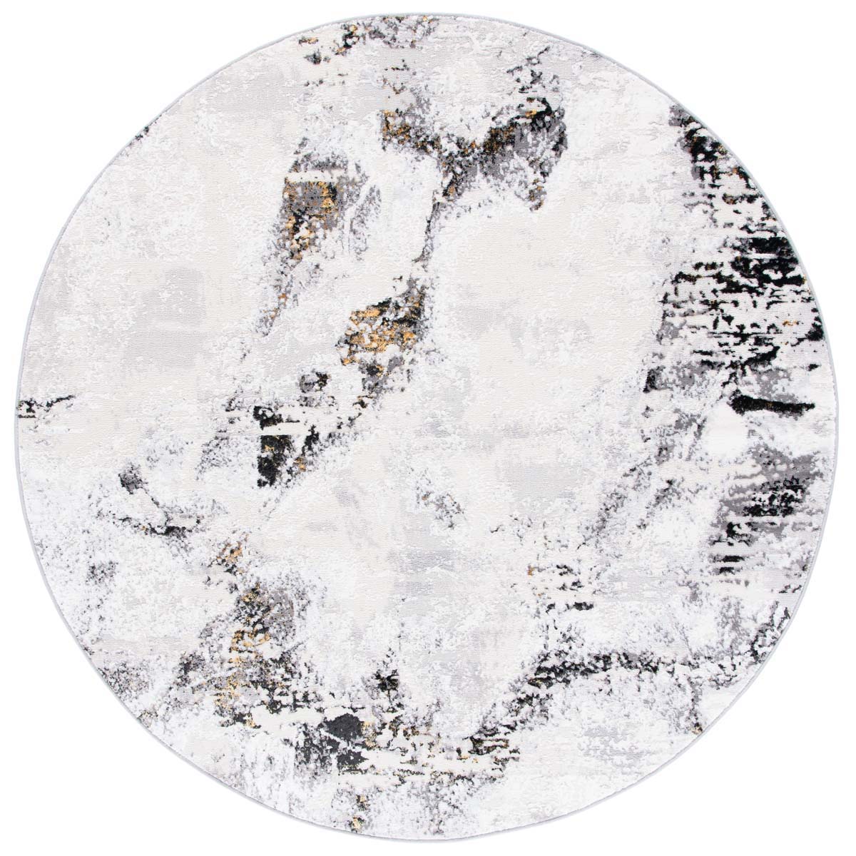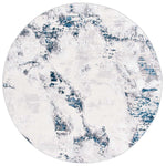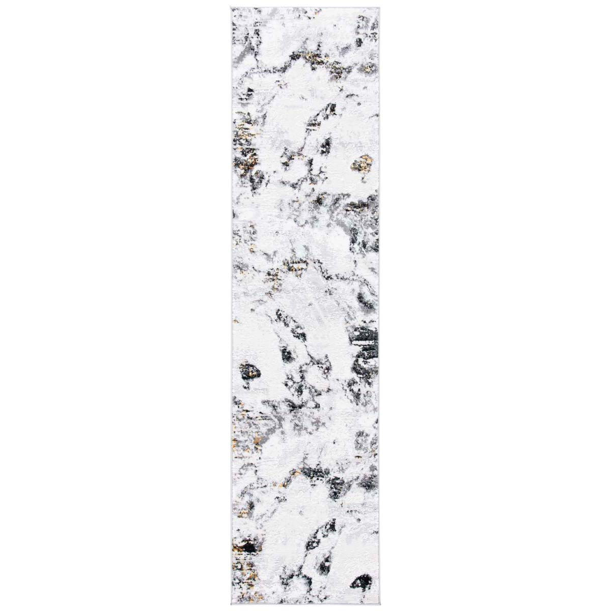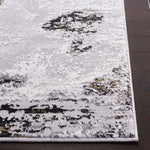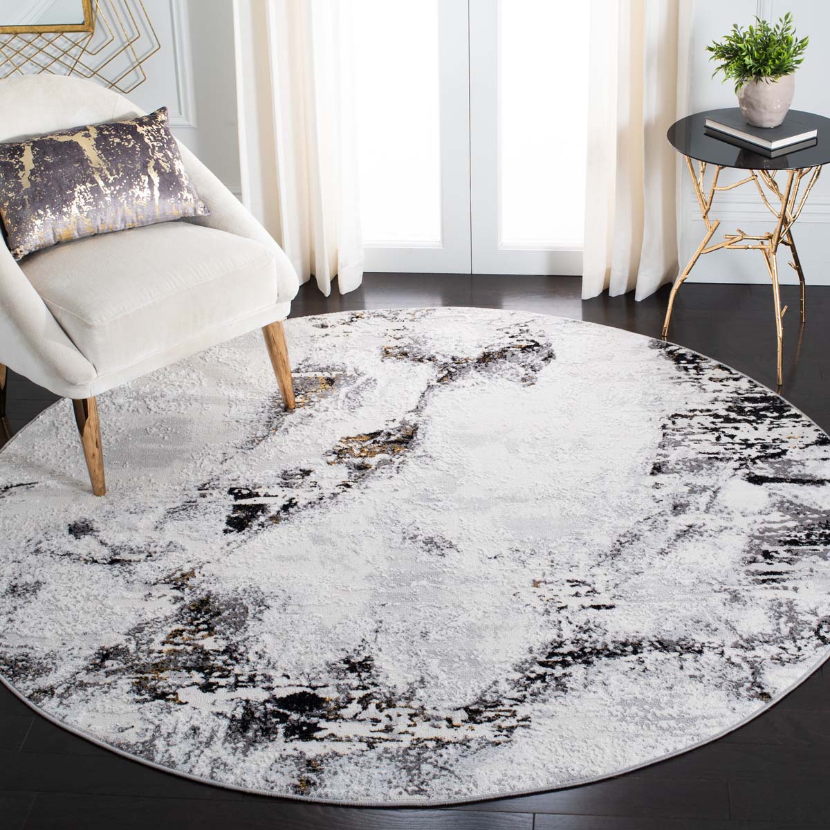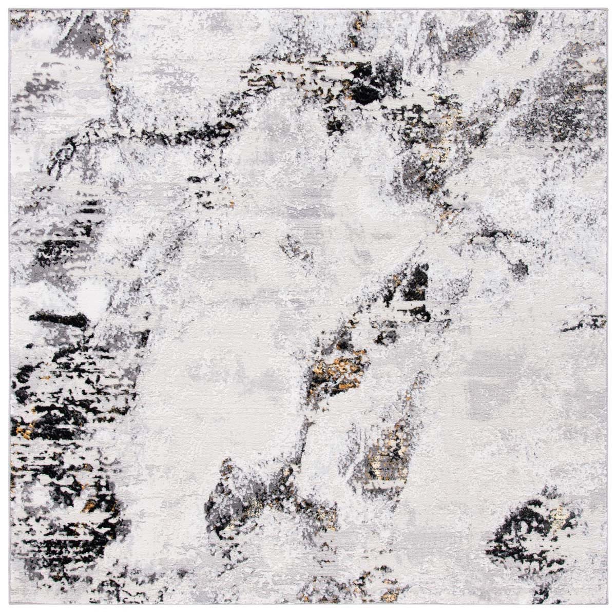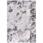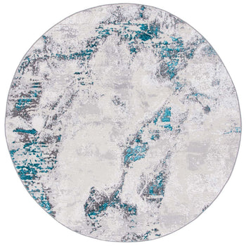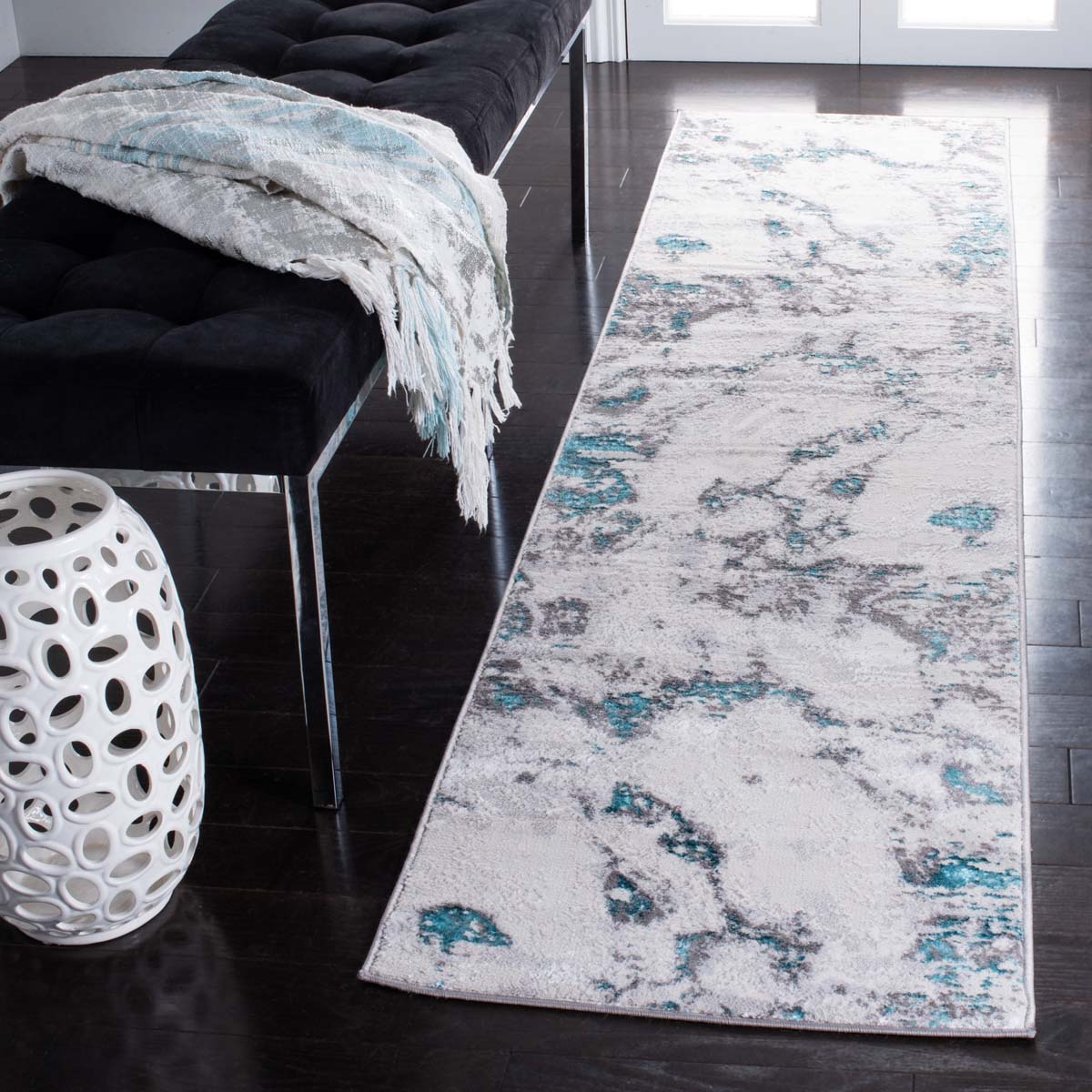 The rug pattern features an abstract mix of grey hues with vivid blue accents that create a dynamic and visually striking appearance. The design embodies a blend of artistry and sophistication that will capture attention and seamlessly integrate into a contemporary decor theme.
