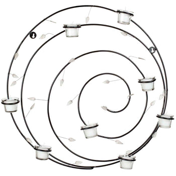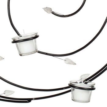 A contemporary take on traditional scroll and leaf designs, the Tea Light wall sconce adds a swirl of life to any wall. Crafted from wrought iron with a black finish on the frame, this eight candle sconce features delicate silvery leafs for subtle effect.